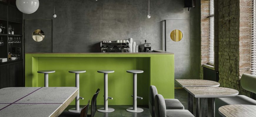«Винная полка и столешница изготовлены из переработанного пластика. В конструктивизме активно использовались новые строительные материалы и технологии, которые стали доступны благодаря индустриализации. Наш выбор — своего рода «пощечина» винному снобизму. Центром композиции стала барная стойка, покрытая светло-зеленым микроцементом, который мастер-декоратор Катя Быстрова окрасила на месте. Этот материал очень тактильный и достаточно прочный, чтобы его можно было использовать на контактной барной стойке».