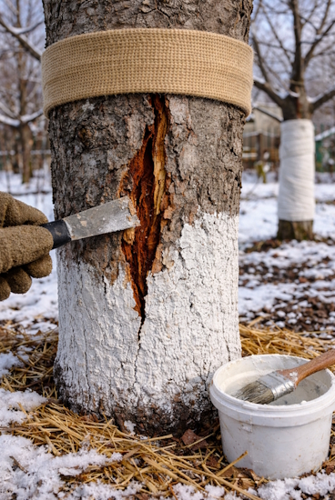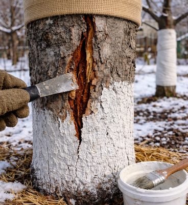 Обычно кора трескается в конце зимы и в начале года из-за резких перепадов температуры. В солнечные дни стволы сильно нагреваются, особенно с южной стороны, а ночью температура резко падает. Древесина и кора расширяются и сжимаются неравномерно, вызывая продольные трещины. Именно поэтому садоводы рекомендуют зимой белить деревья; светлая поверхность отражает солнечные лучи и снижает риск перегрева.