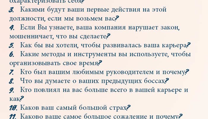«Главный показатель — обсуждение каких-то задач, стоящих перед компанией. Работодатель ищет человека для выполнения определенных задач, эти задачи — его больное место. И если он увидит в претенденте на вакансию того «врача», который придет его лечить, он, естественно, начнет об этом говорить», — отметил эксперт.