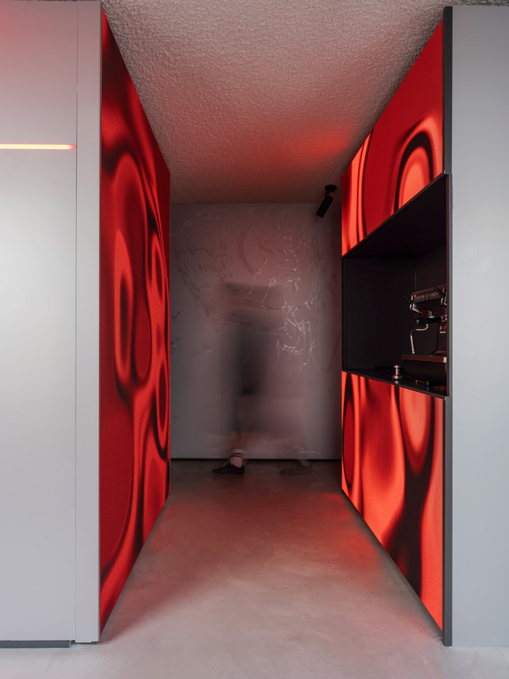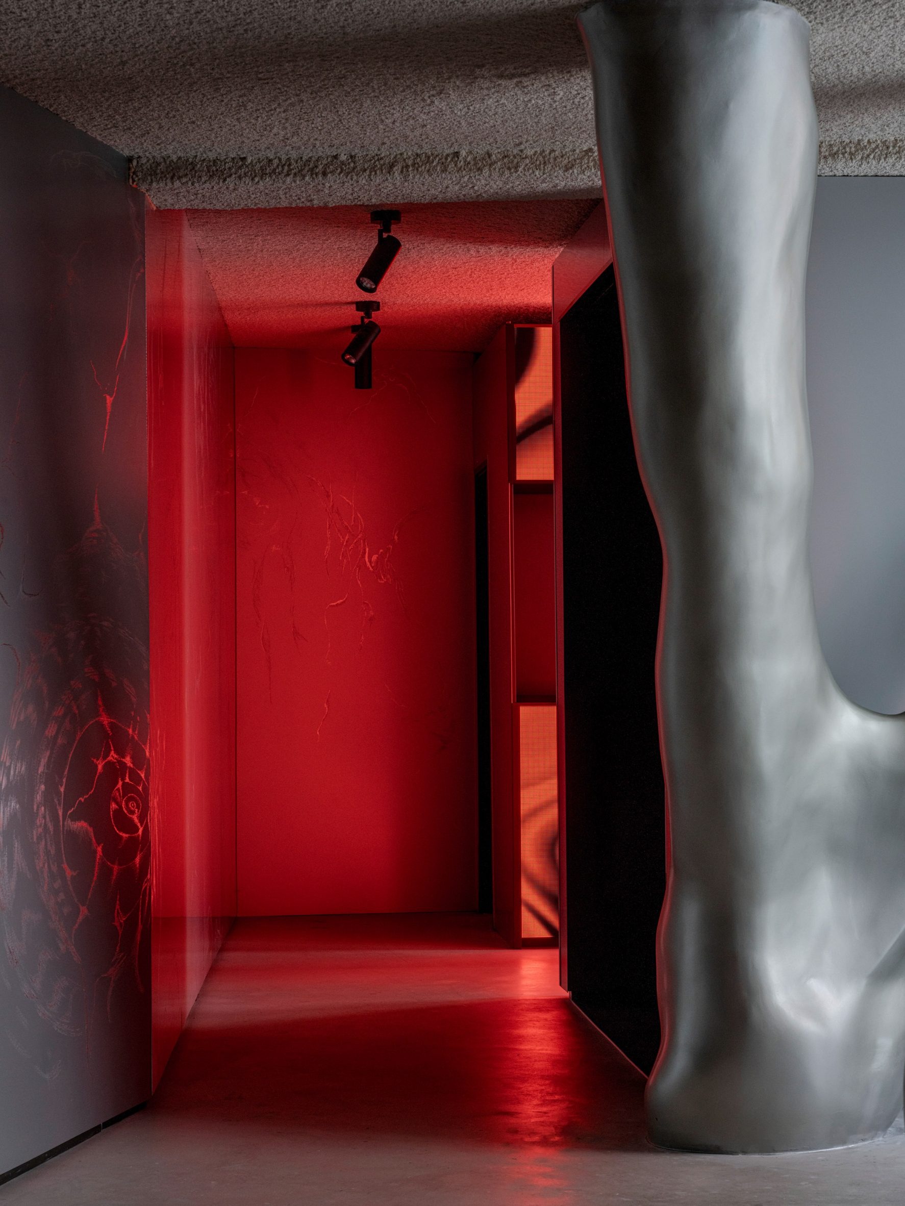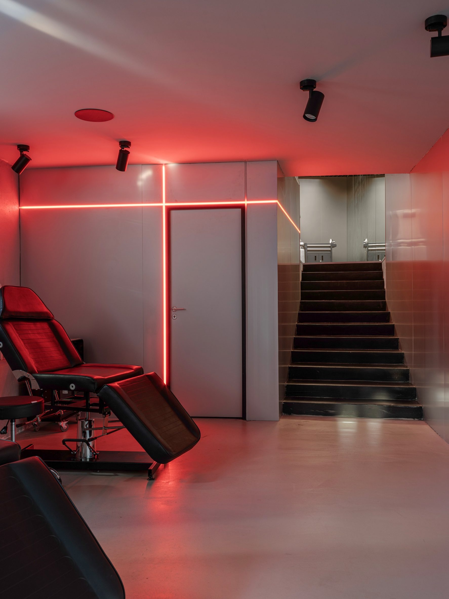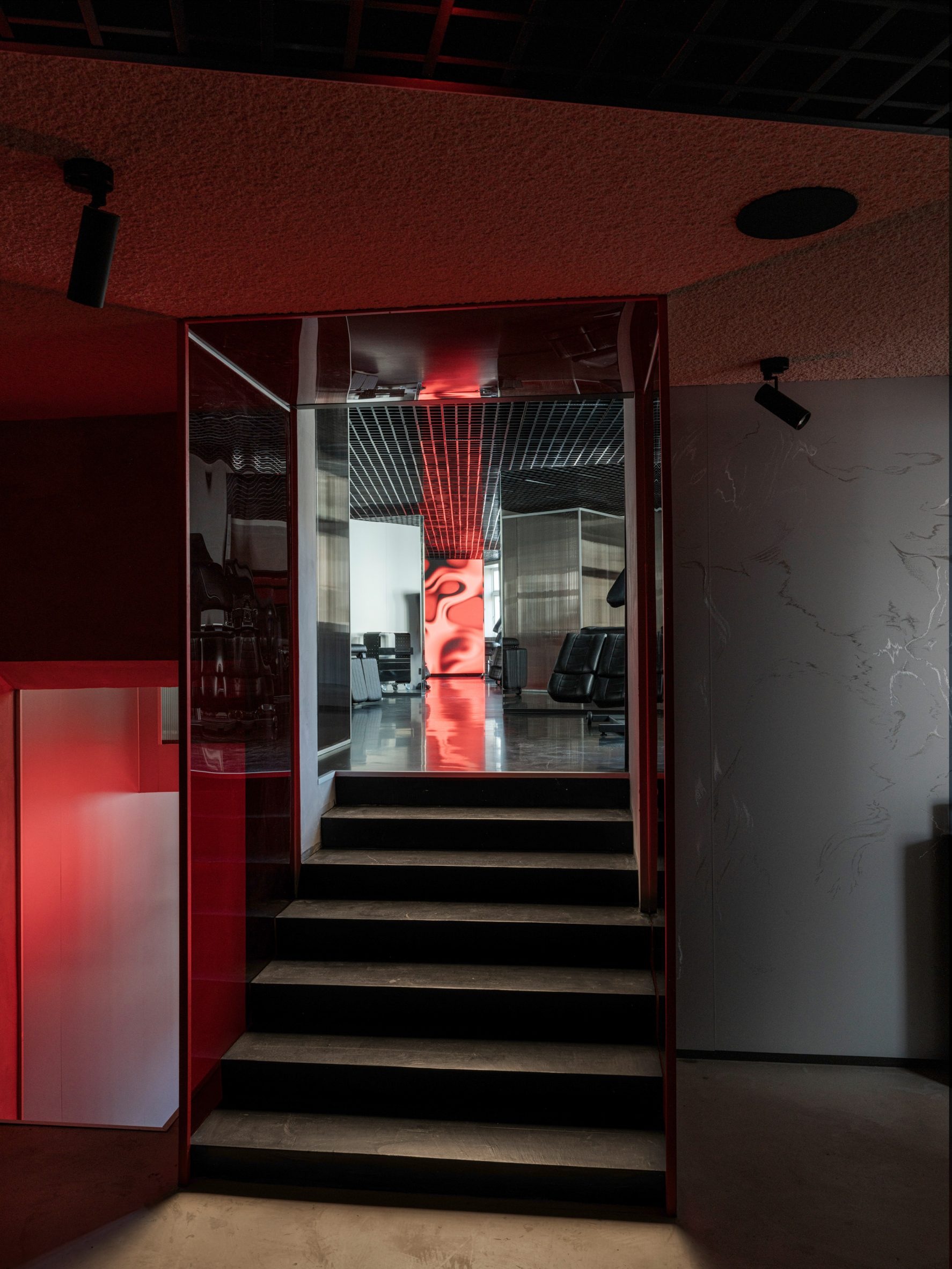 Планировка состоит из кубических объемов со встроенными светодиодными экранами, излучающими динамическую красную графику. В коридоре стены украшены абстрактной металлической «гравюрой». Эта техника является прямой отсылкой к татуировке: поверхность кажется «сшитой» и измененной. Лестница, обрамленная красными стеклянными панелями, ведет посетителя к рабочим узлам и «зоне трансформации», где есть шезлонги для клиентов и стулья для мастеров. Палитра материалов осталась прежней: бетон, красная линия освещения, индустриальная точность.