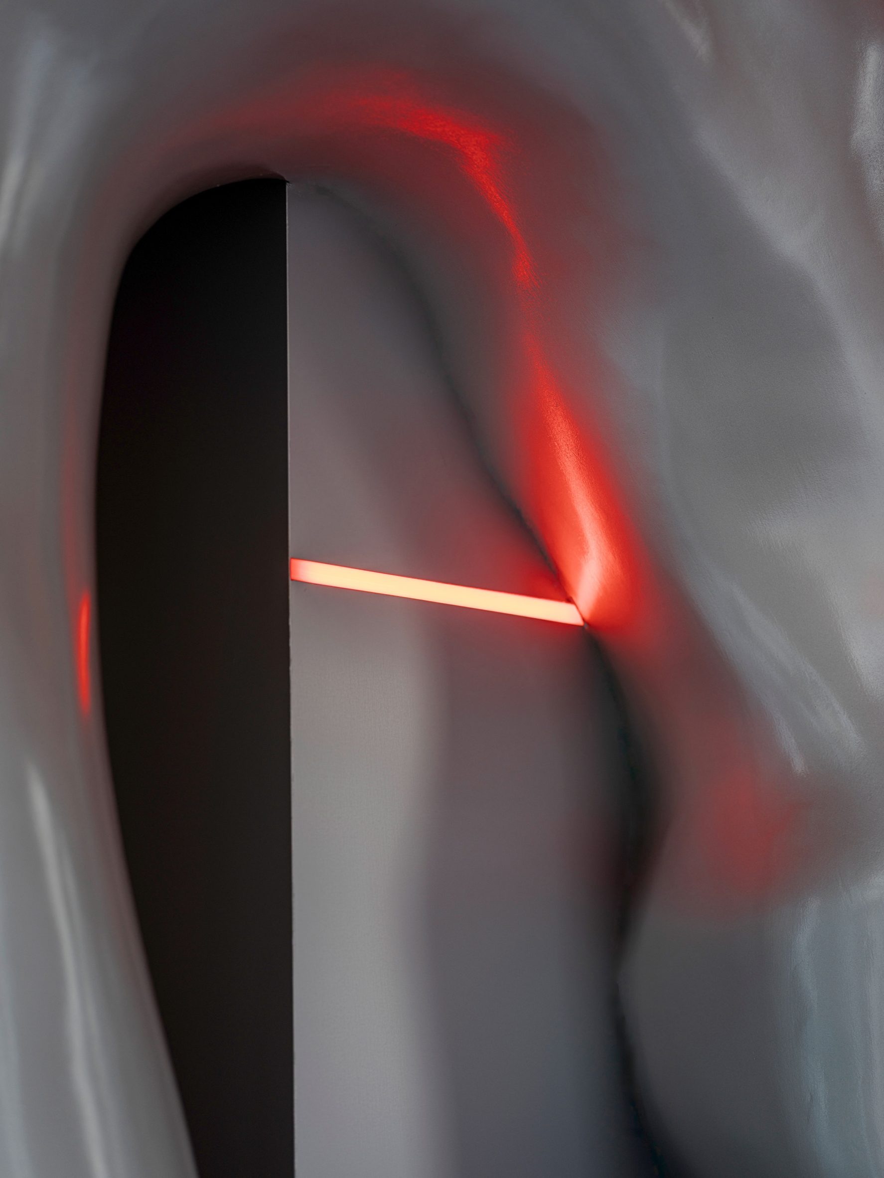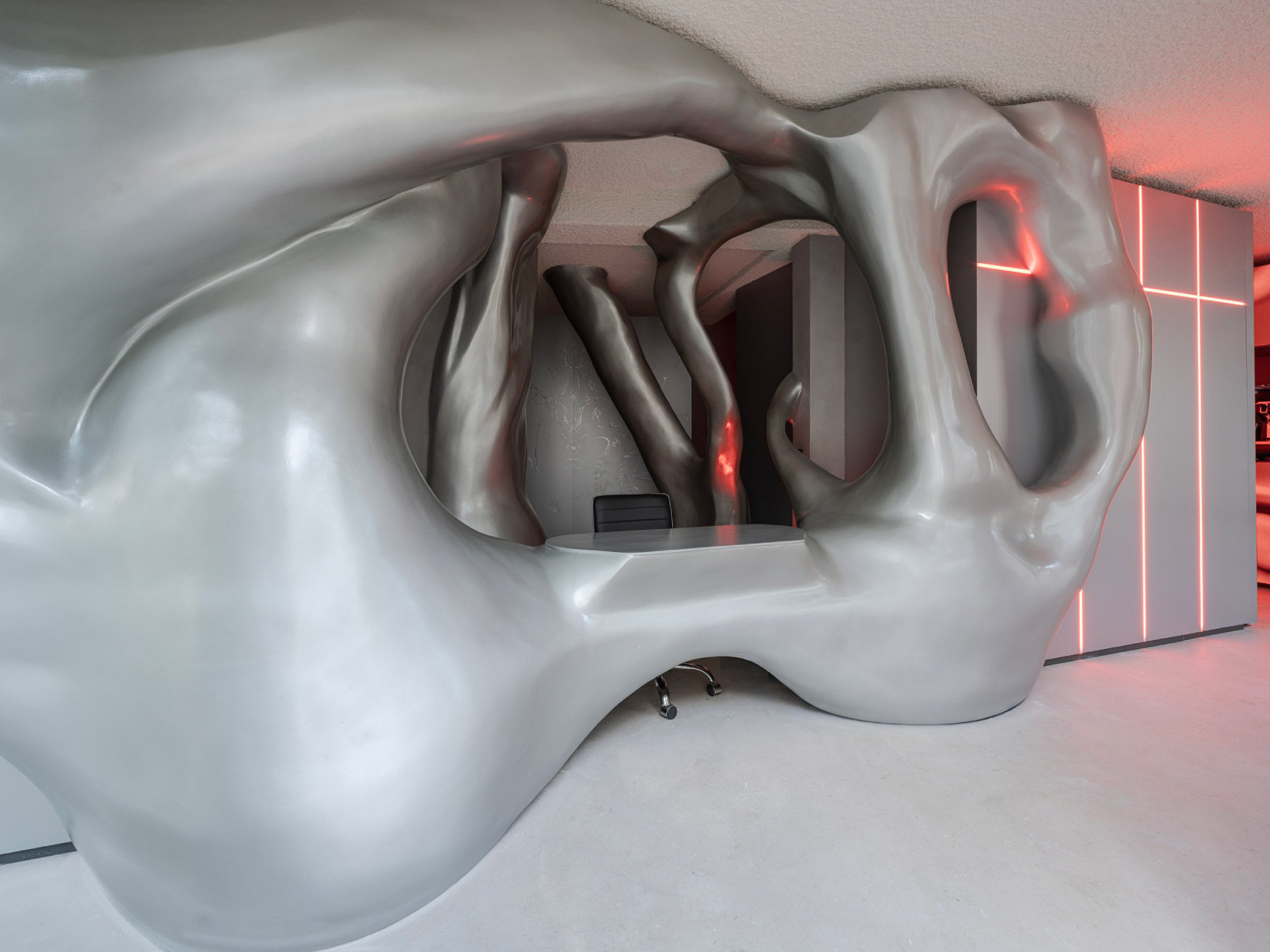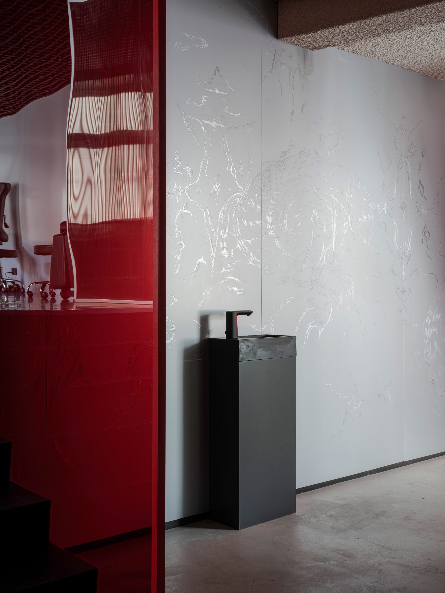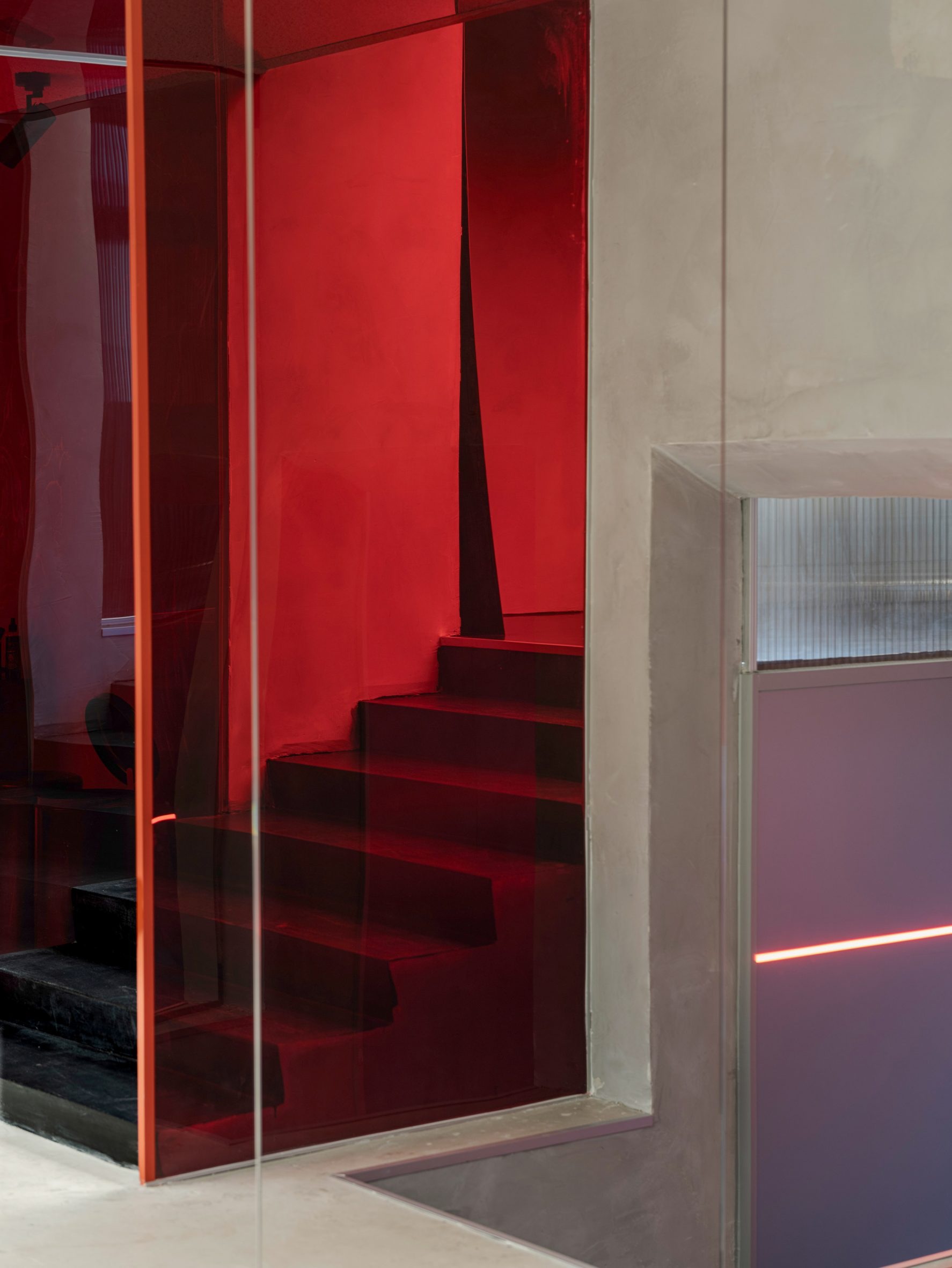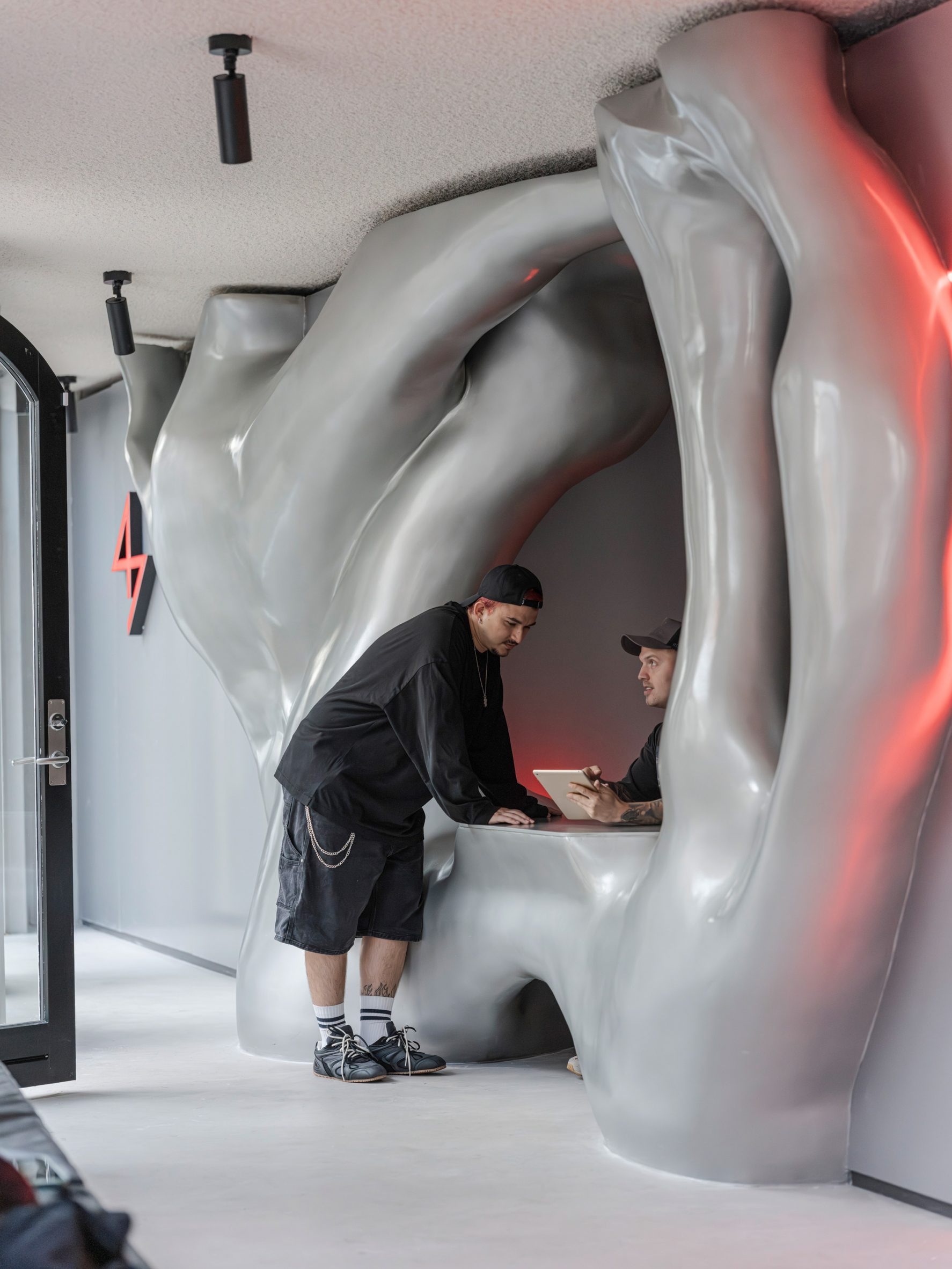 Планировка состоит из кубических объемов со встроенными светодиодными экранами, излучающими динамическую красную графику. В коридоре стены украшены абстрактной металлической «гравюрой». Эта техника является прямой отсылкой к татуировке: поверхность кажется «сшитой» и измененной. Лестница, обрамленная красными стеклянными панелями, ведет посетителя к рабочим узлам и «зоне трансформации», где есть шезлонги для клиентов и стулья для мастеров. Палитра материалов осталась прежней: бетон, красная линия освещения, индустриальная точность.