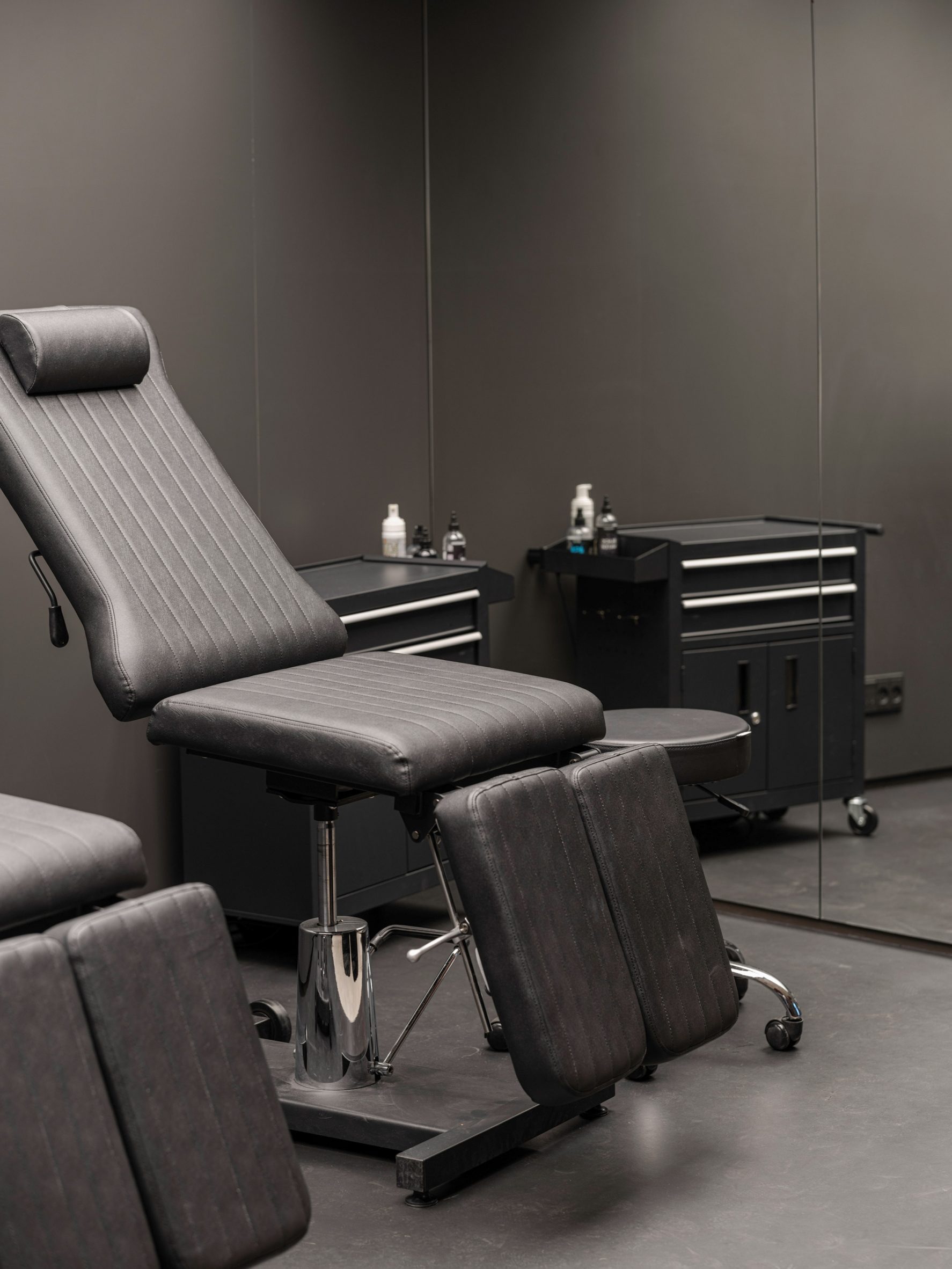 По мнению авторов, процесс нанесения татуировки — это персональная метаморфоза: человек приходит с «чистой» кожей, а уходит со стойким отличительным знаком. Команда воплотила эту идею в пространственную драматургию. Вход спроектирован как иммерсивная инсталляция, призванная вызвать любопытство и предвкушение нового преобразующего опыта. Пространство образует большая аморфная скульптура, обрамляющая стойку администратора, сделанная из пенопласта, покрытого автомобильной шпаклевкой и покрытой глянцевой серебристой краской. Пол и стены отделаны бетоном; По периметру мягкий диван.