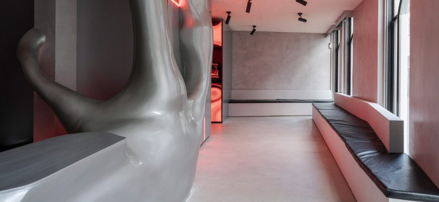Планировка состоит из кубических объемов со встроенными светодиодными экранами, излучающими динамическую красную графику. В коридоре стены украшены абстрактной металлической «гравюрой». Эта техника является прямой отсылкой к татуировке: поверхность кажется «сшитой» и измененной. Лестница, обрамленная красными стеклянными панелями, ведет посетителя к рабочим узлам и «зоне трансформации», где есть шезлонги для клиентов и стулья для мастеров. Палитра материалов осталась прежней: бетон, красная линия освещения, индустриальная точность.