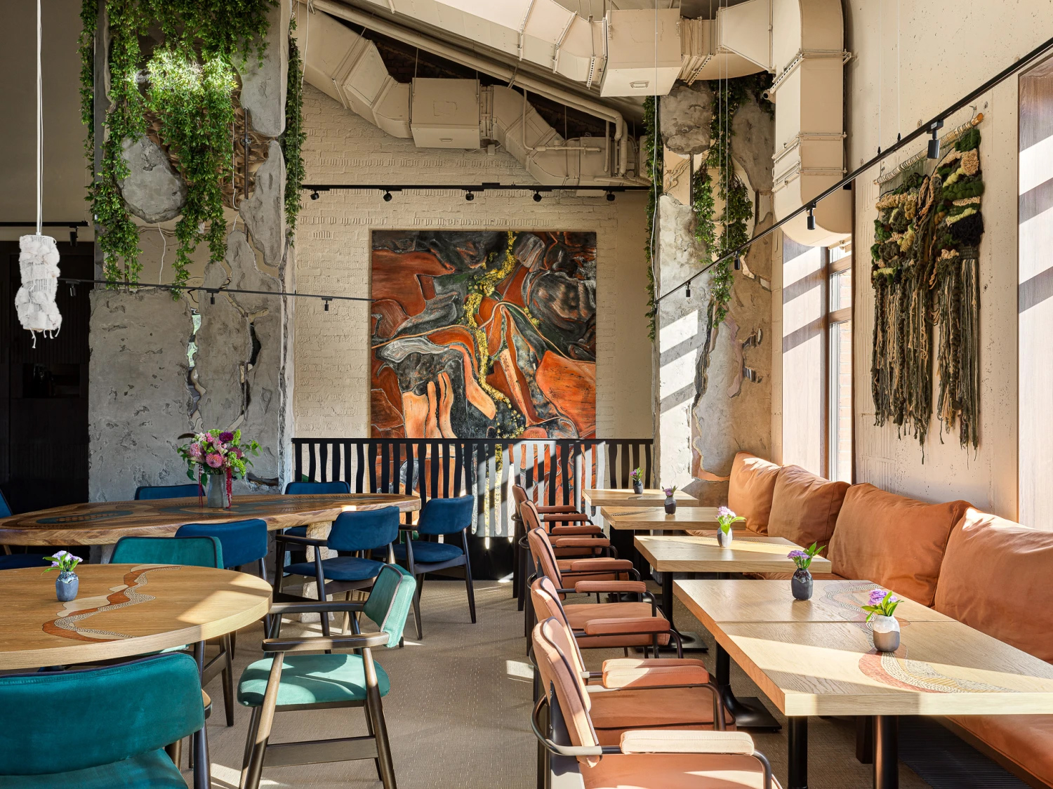 Ресторан Terra et Silva («Земля и лес») транслирует концепцию здорового и разнообразного питания, которое сочетает дары земли и леса. Для оформления интерьера рестораторы Фанис Гарафиев и Владимир Кириллов пригласили Карину Гимранову и ее архитектурное бюро Duplex. Перед командой стояла задача рассказать историю о связи ручного труда и гастрономического изобилия. Дизайнеры создали образы земли и леса, интерпретировав природные сюжеты и метафоры. На первом этаже авторы обратились к прообразу современных домов — мазанке из глины и соломы. Ремесленным поверхностям противопоставляется фактура нержавеющей стали, дающей ощущение чистоты и технологичности. Усилить природное настроение призваны бионические силуэты и тактильно приятные материалы. «Символом ресторана можно назвать светильник ручной работы, форму которого мы позаимствовали у природы, — говорит Карина Гимранова. — Это стилизованная коробочка с семенами лотоса — lotus pod — предмет легенд, связанных с плодородием, урожаем, бессмертием. В компанию лотосу — подвесные светильники-бутоны на перекрученном жгуте».