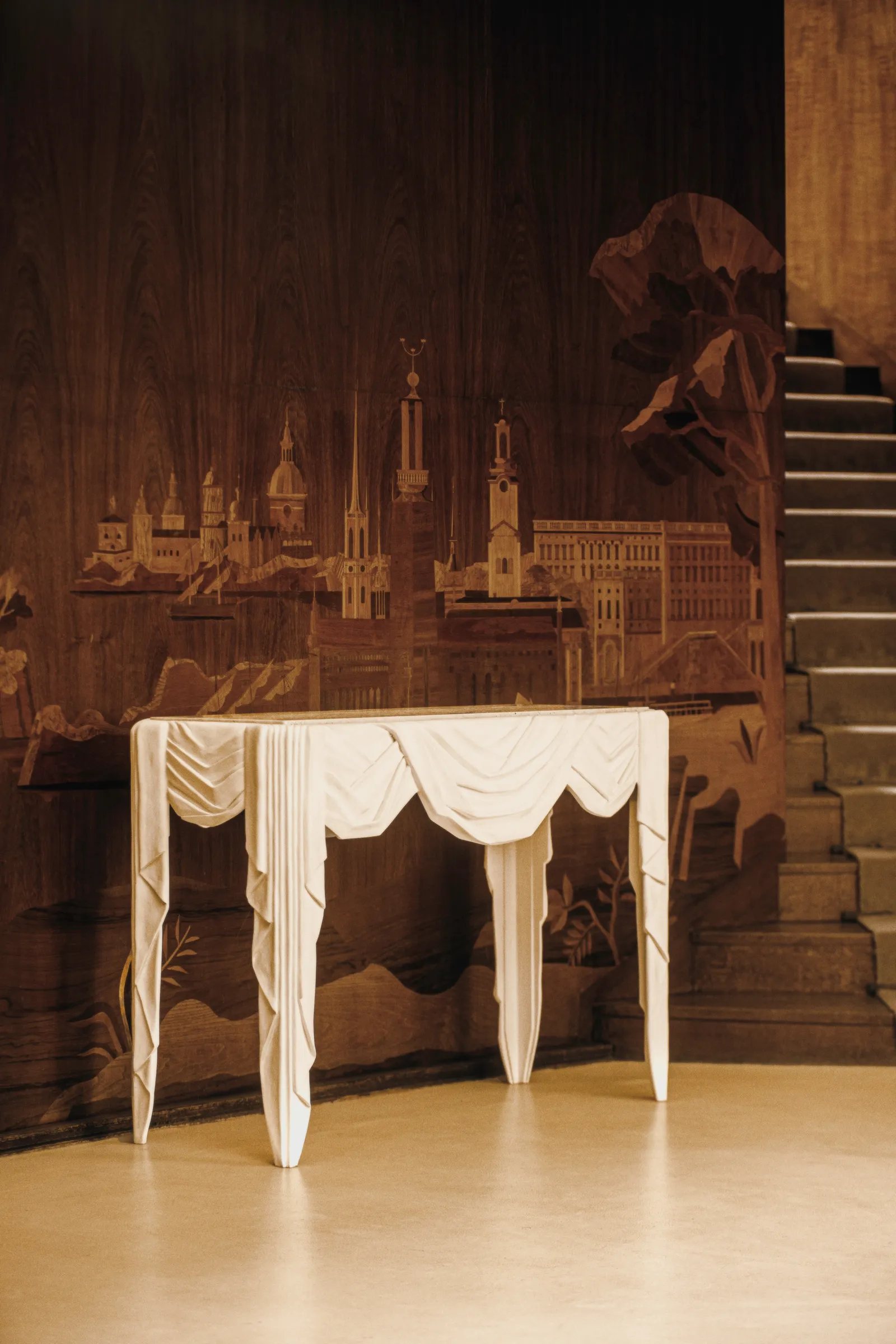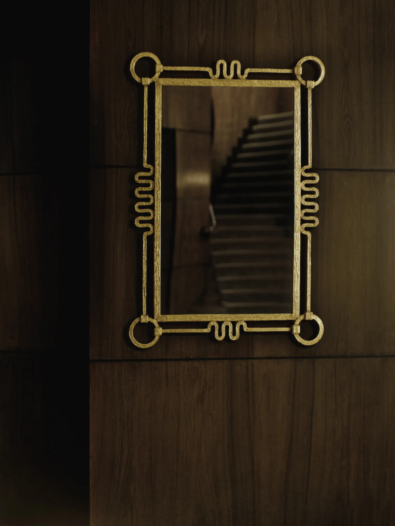 Коллекция выглядит театрально, но не кричаще, декоративно, но не вычурно, выразительно, но не навязчиво. Предметы линии – столы, светильники, консоли, зеркала – тонко отсылают к античной эстетике (например, основание журнального столика напоминает очертания ионической колонны). Эрдей создал первые прототипы из ткани – отсюда и мягкие шторы, которые со временем воплотились в металле. Отделки разработаны мастерами Porta Romana: все они отличаются выразительной, словно состаренной фактурой, создающей ощущение предметов с историей.