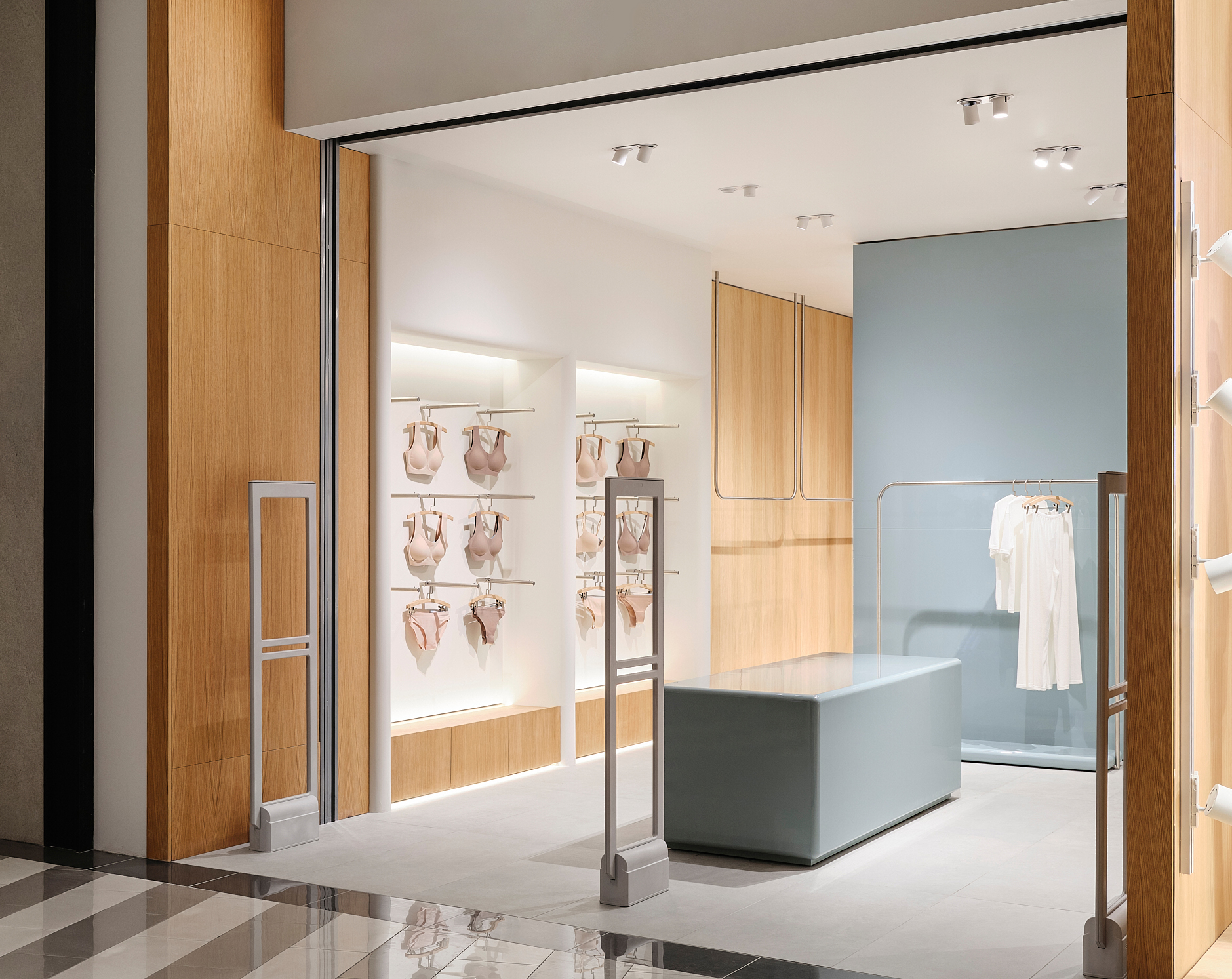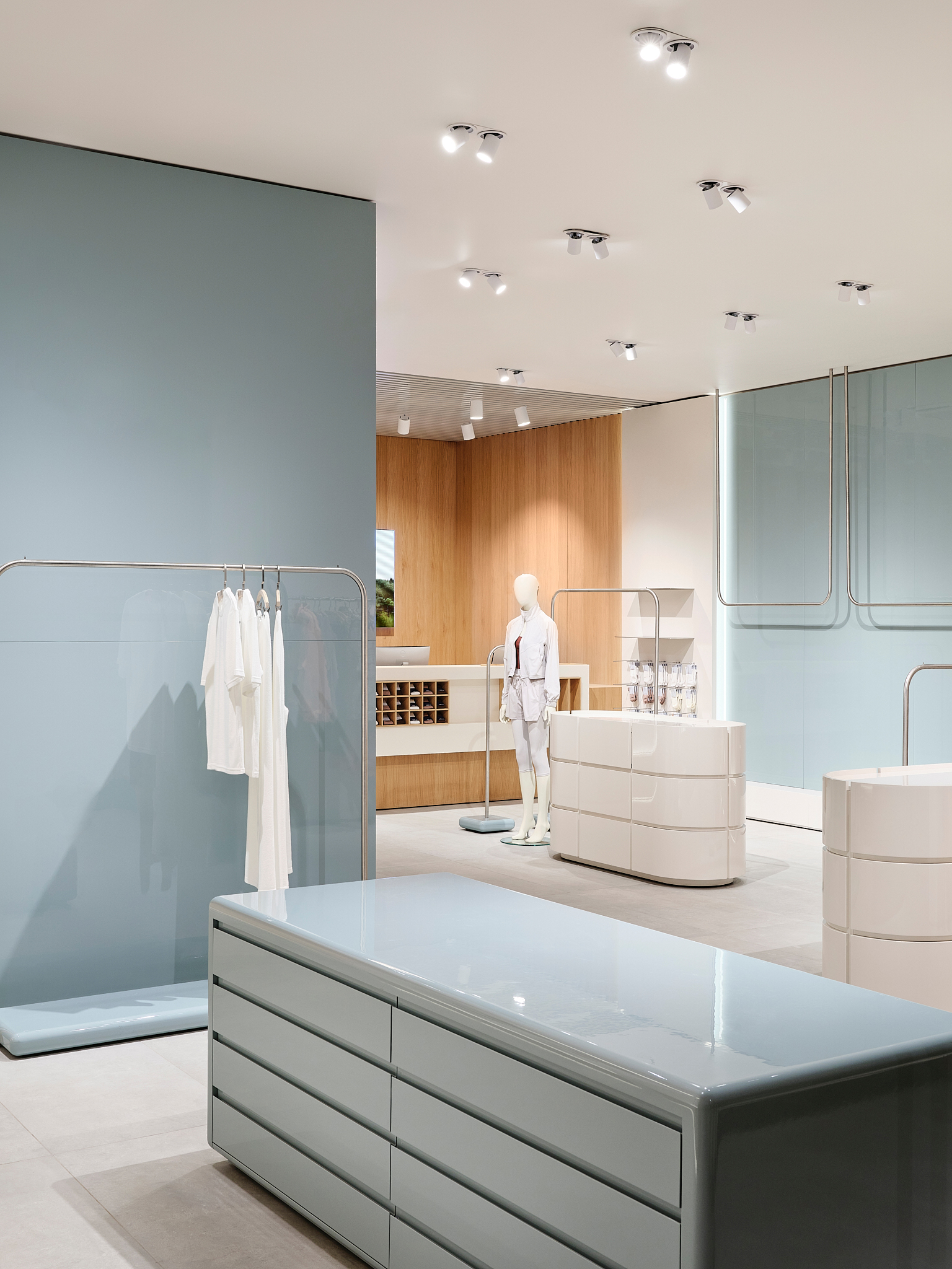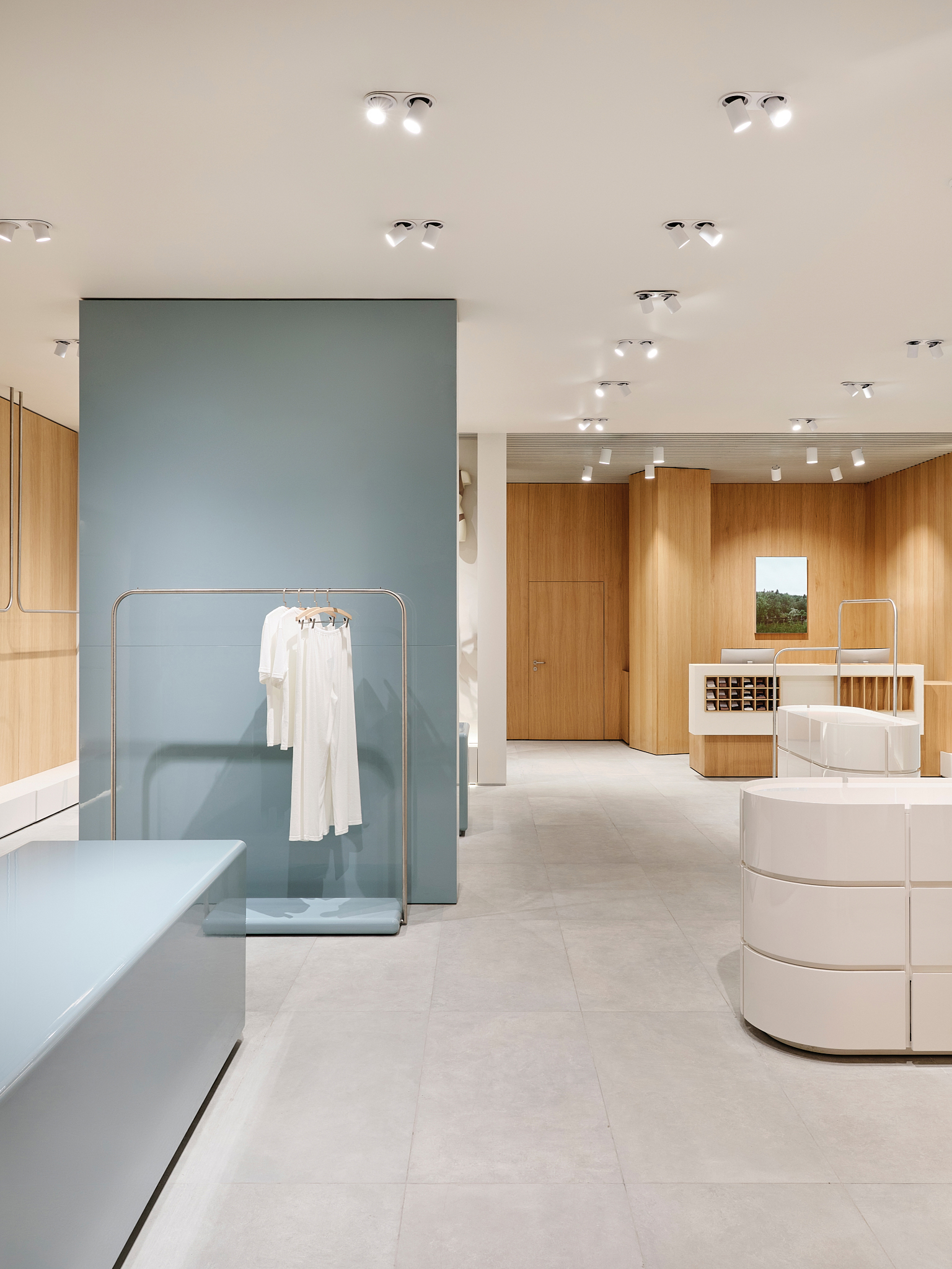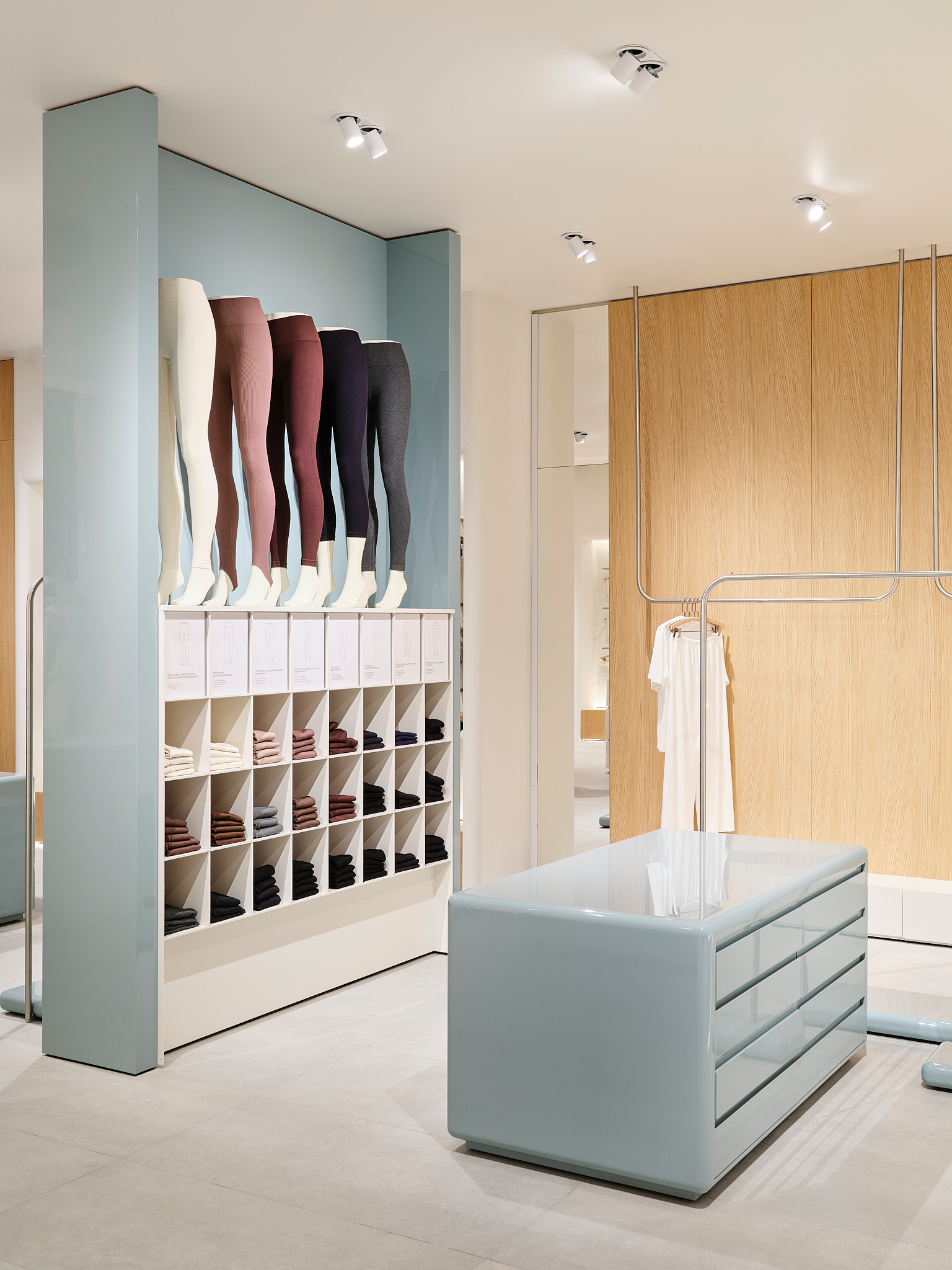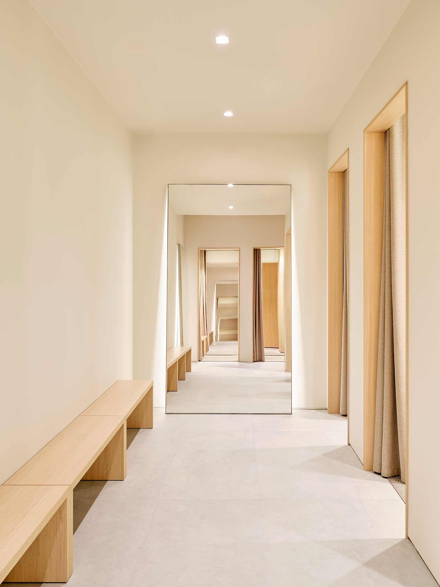 Архитекторы постарались сделать примерочные максимально удобными. Свет, материалы, расстановка мебели и ритм интерьера вторичны по отношению к общей идее: дать возможность покупателю замедлиться и прислушаться к своим ощущениям.