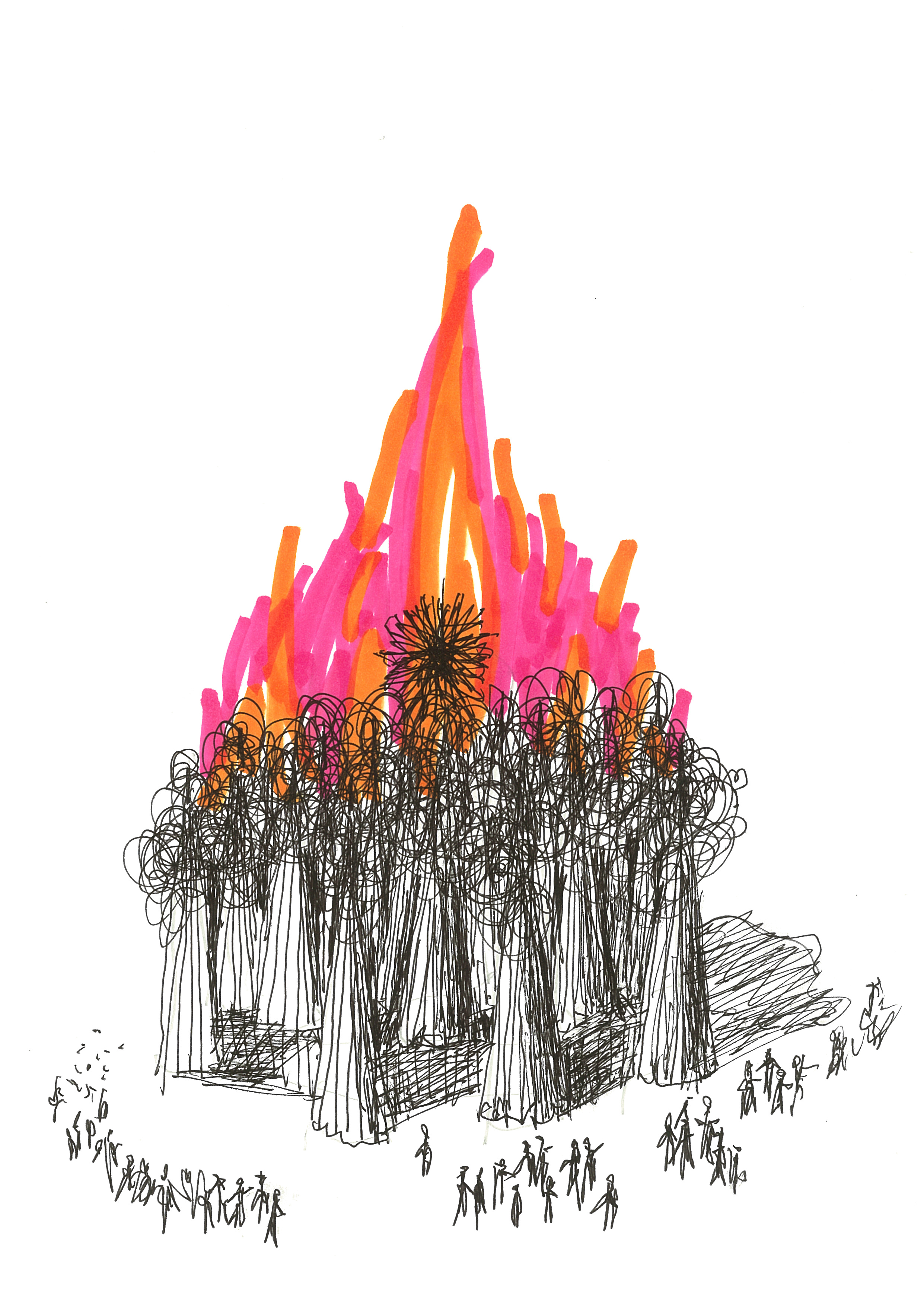Арт-объект состоит из 16 башен разного размера, которые символизируют темный лес. В центре находится сцена-цилиндр, на которой краном поднимают метафорическое сердце перед сожжением. Он сначала загорится, а затем рухнет, поджигая стволы башни. Высота объекта составит 25 метров. Для строительства использовали плиты, лозы, тонкие пластины и поддоны – бросовый и непригодный для других целей материал.