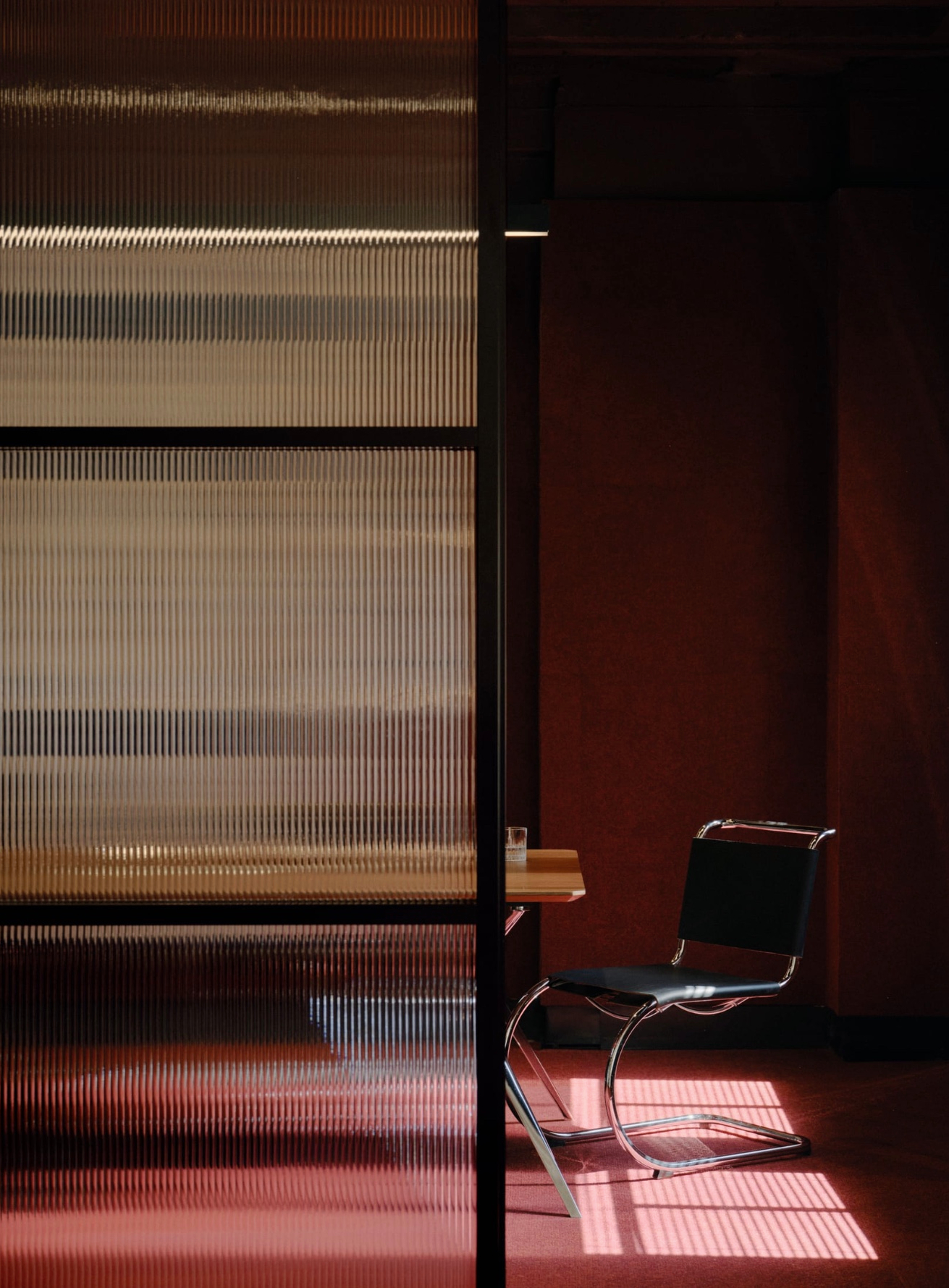 Палитра материалов во многом определялась бюджетными ограничениями. Существующий деревянный пол был отшлифован и покрашен в темный цвет, что сделало его связующим элементом всего пространства. Дневной свет, проникающий сквозь полупрозрачные шторы и отражающийся через стены из волнистого стекла, подчеркивает контраст фактур: в интерьере присутствуют детали из хрома, дерева и разных видов текстиля.