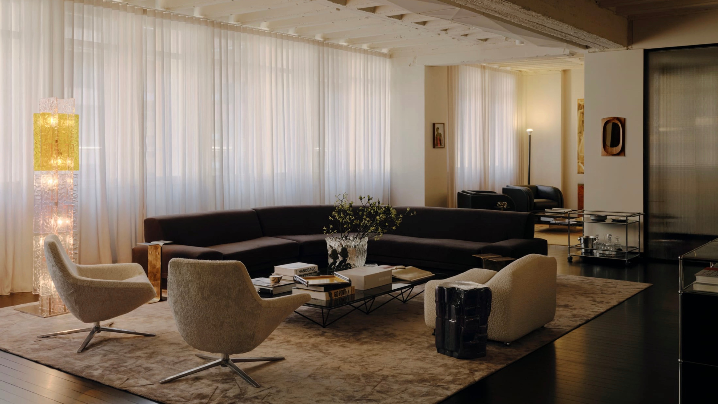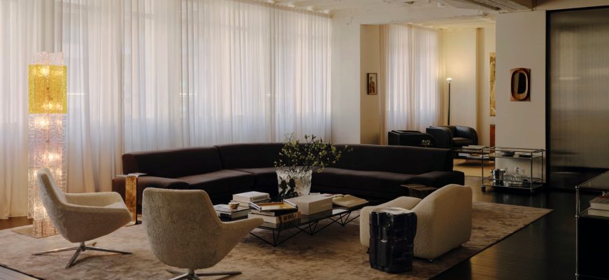 В этом районе винтажные стулья и кресла Fritz Hansen от Pierre Paulin и B&B Italia соседствуют с современными предметами — диваном Agent 86 от Grazia & Co и системами хранения USM Haller. Золотые столы Putrellino от Dimore Milano, стеклянные предметы от 6AM Glassworks, аксессуары Генри Уилсона и произведения искусства от Coma Gallery создают многослойную среду с почти жилым тоном, вдохновленным модернизмом.