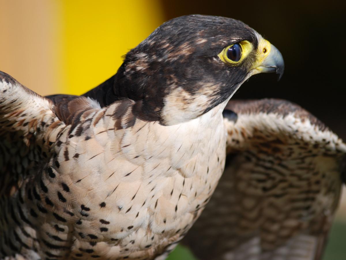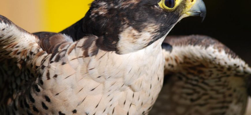 Сапсан – крупный представитель семейства соколиных с размахом крыльев до 120 сантиметров. Его легко узнать по темному «капюшону», серым крыльям с черными кончиками и светлой груди с темными пятнами. Его желтые ноги и шерсть контрастируют с прохладными тонами оперения, а большие выразительные глаза показывают, что это внимательный охотник.