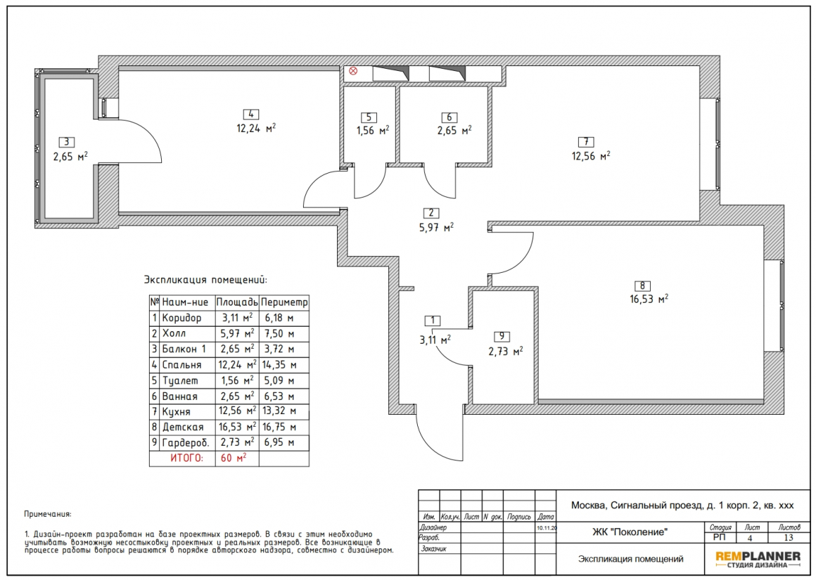 Ремонт дизайнера сообщений о 3 -комнатной квартире в размере 60 м² в новом здании под ключ впервые появился на моем доме.