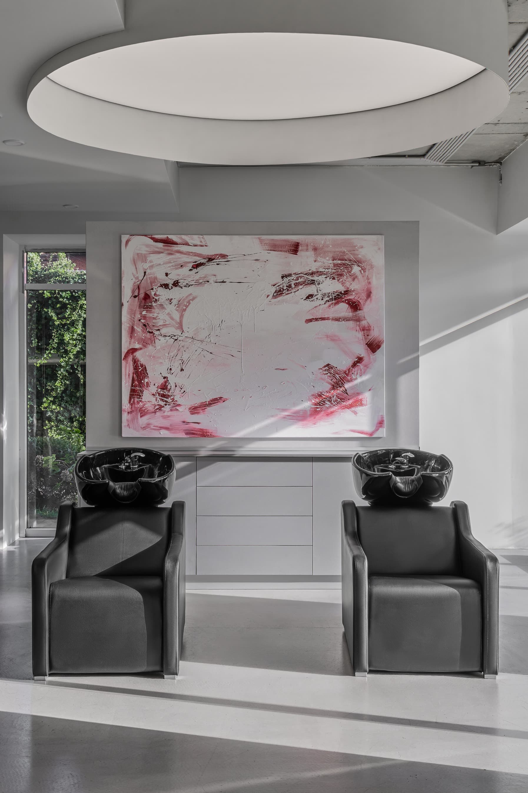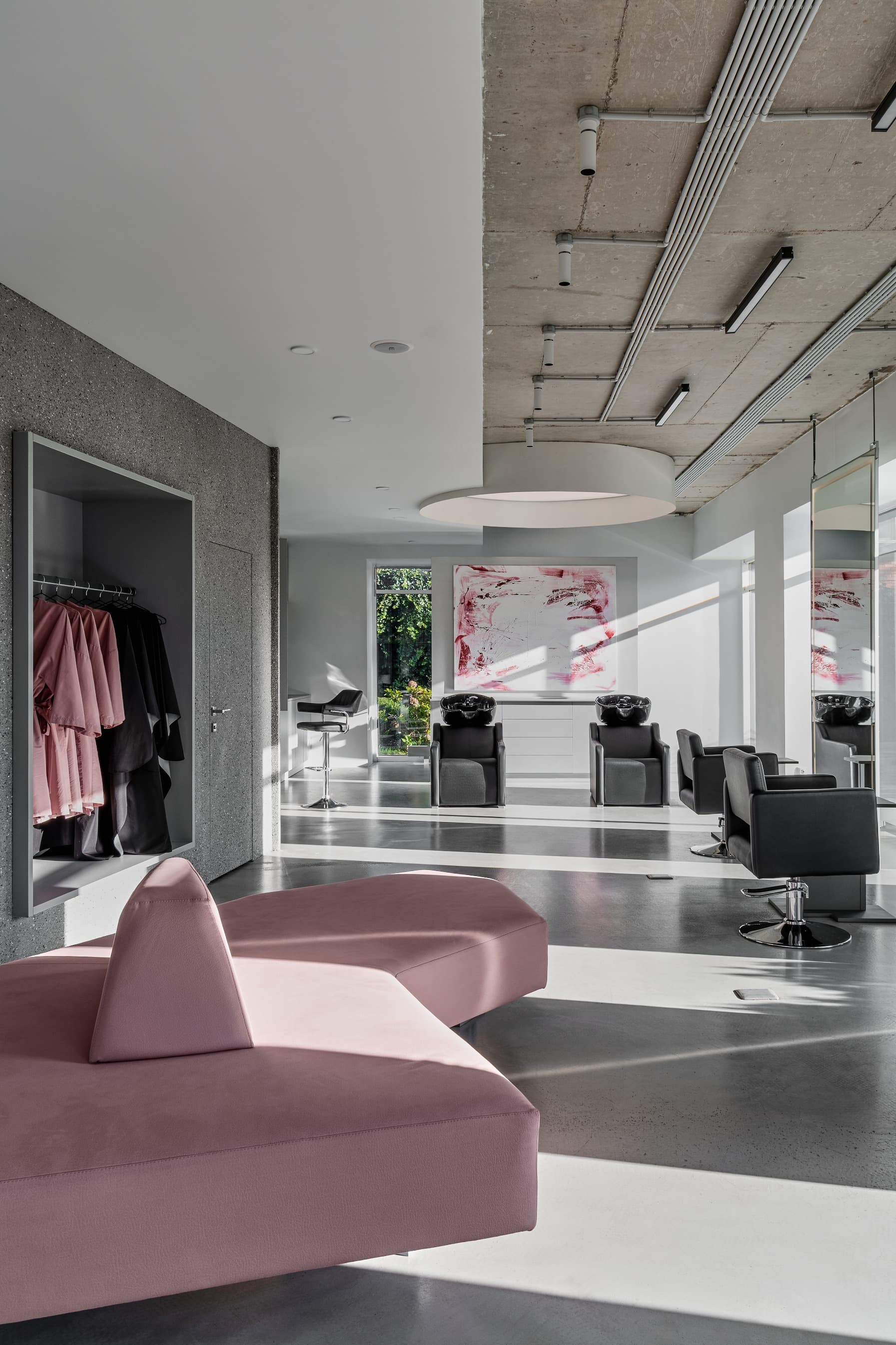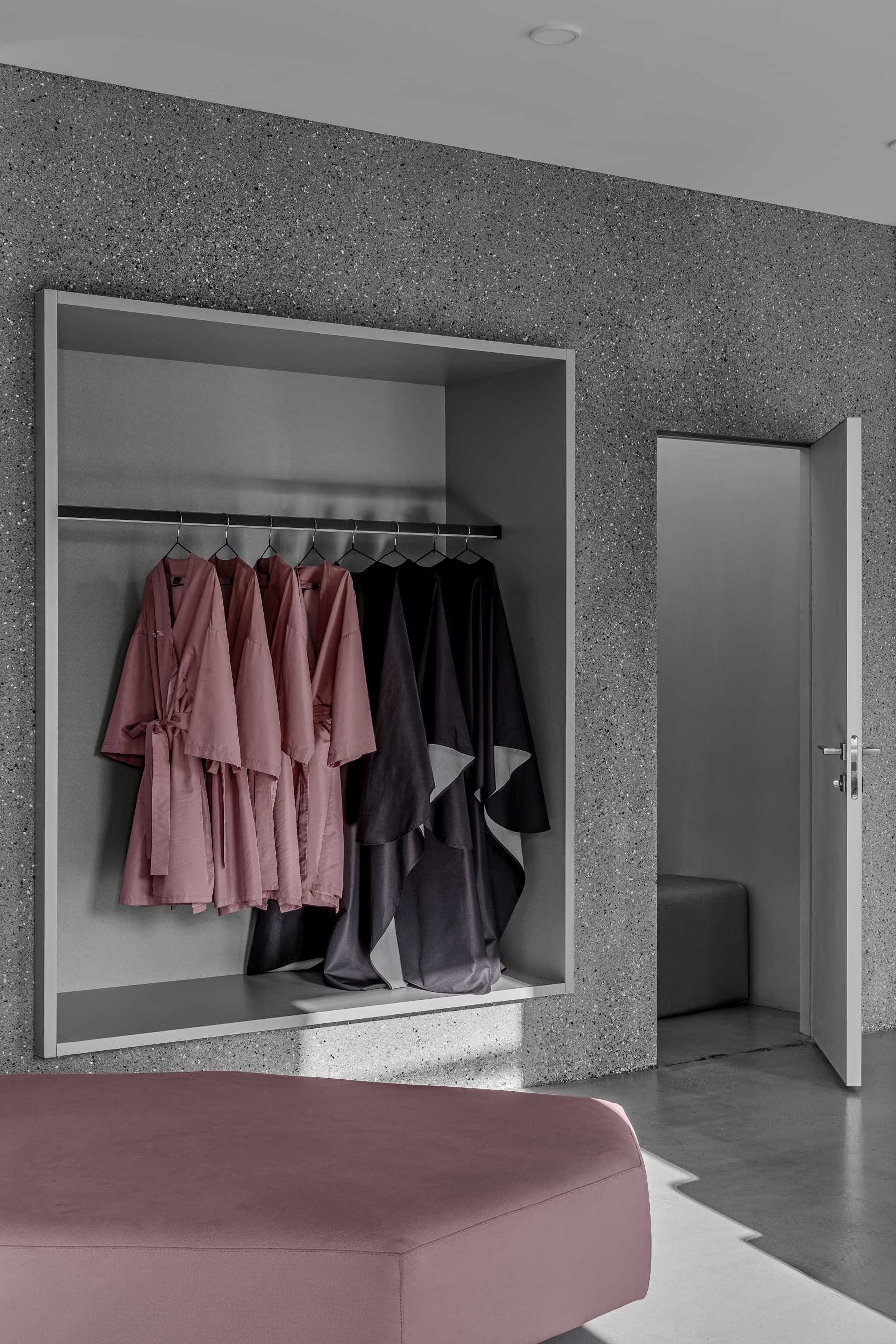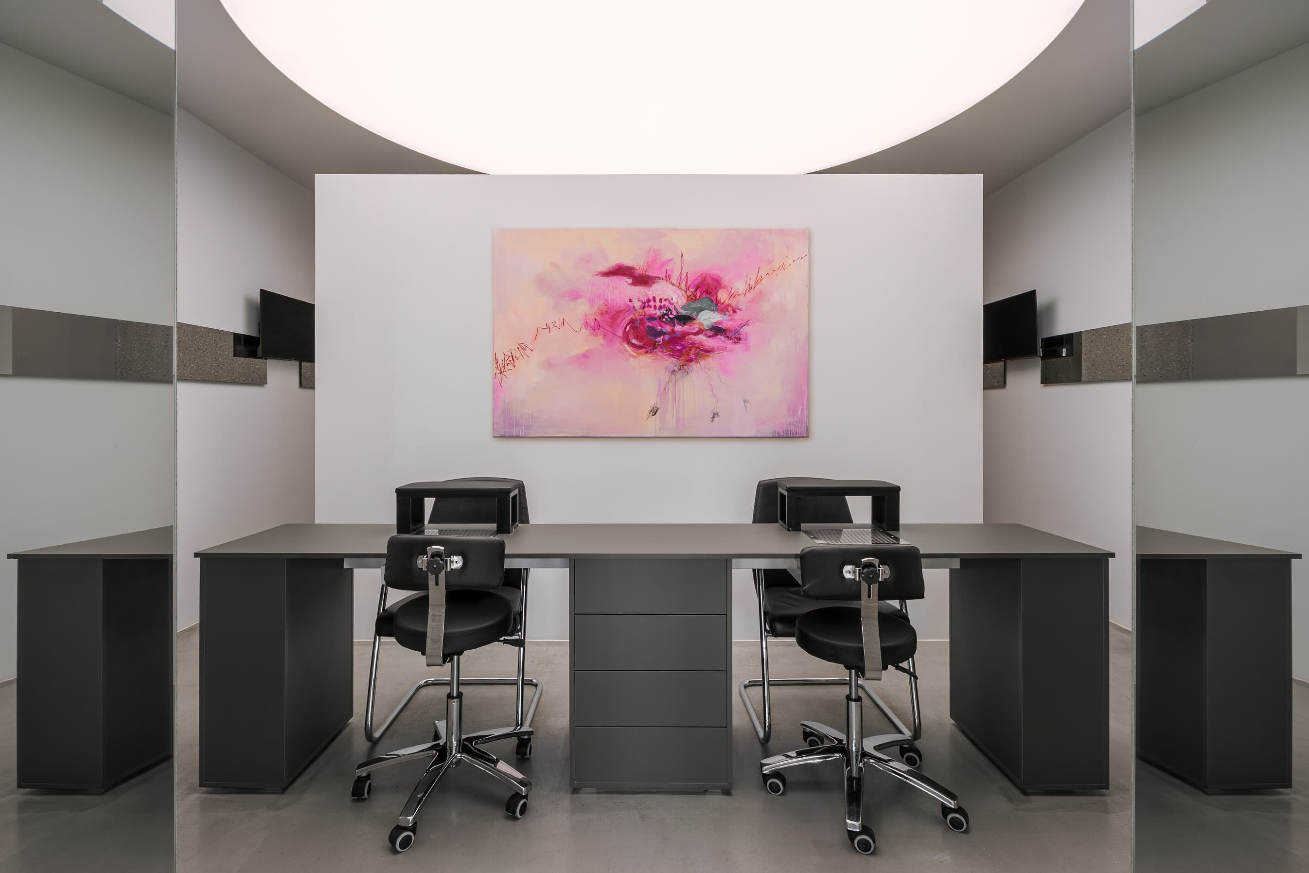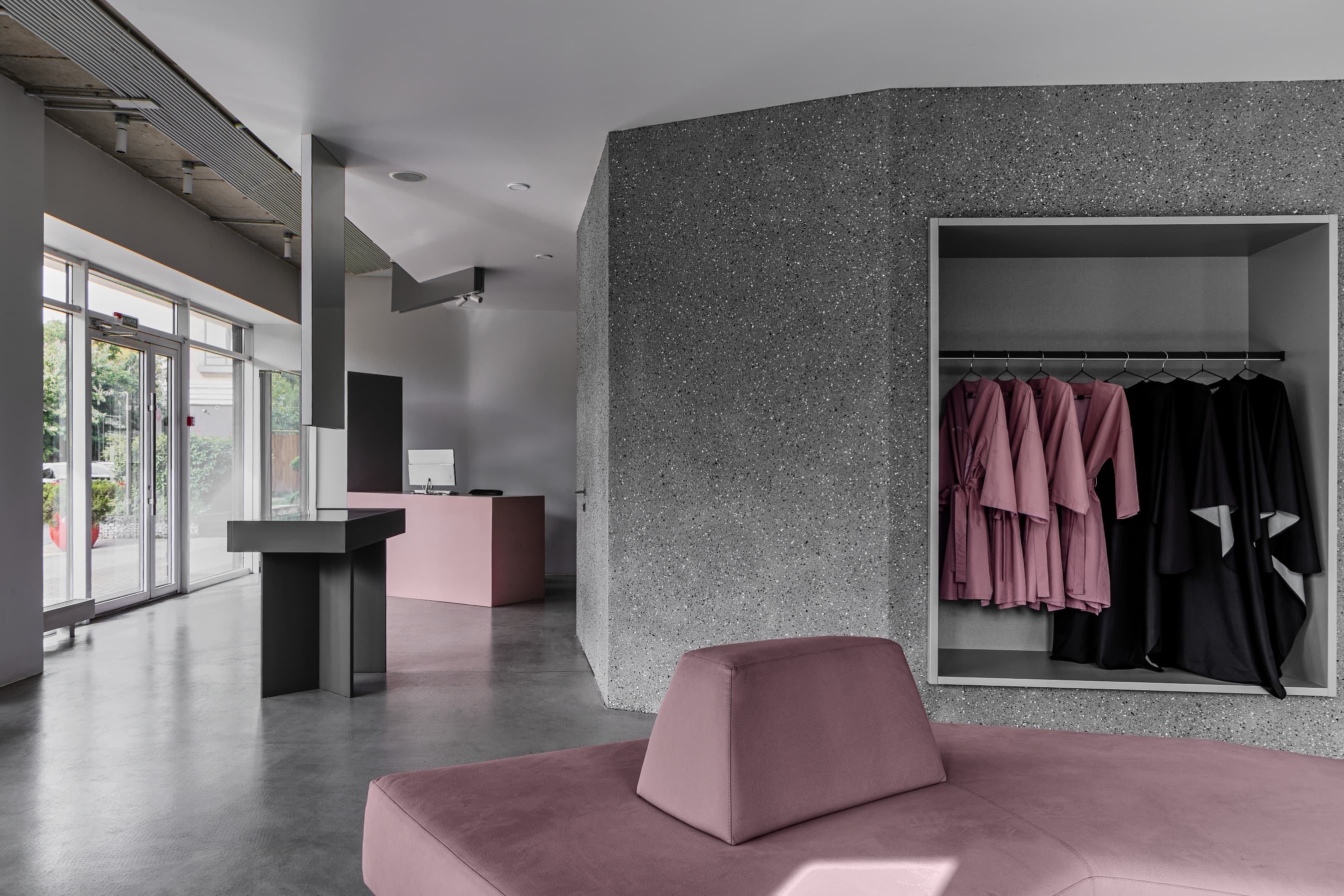 «Клиенты приходили к нам с проработанным брендбуком, в котором преобладали серые и розовые тона. Нашей задачей было облагородить эти цвета, сделать их более сложными и сдержанными. Вся мебель, включая центральный арт-объект — лампу Tesla в зоне ресепшен, — была изготовлена по нашим индивидуальным эскизам. Этот светильник, олицетворяющий силу и энергию, не только приветствует гостей, но и оставляет пространство для взаимодействия: при прикосновении молния устремляется к точке касания».