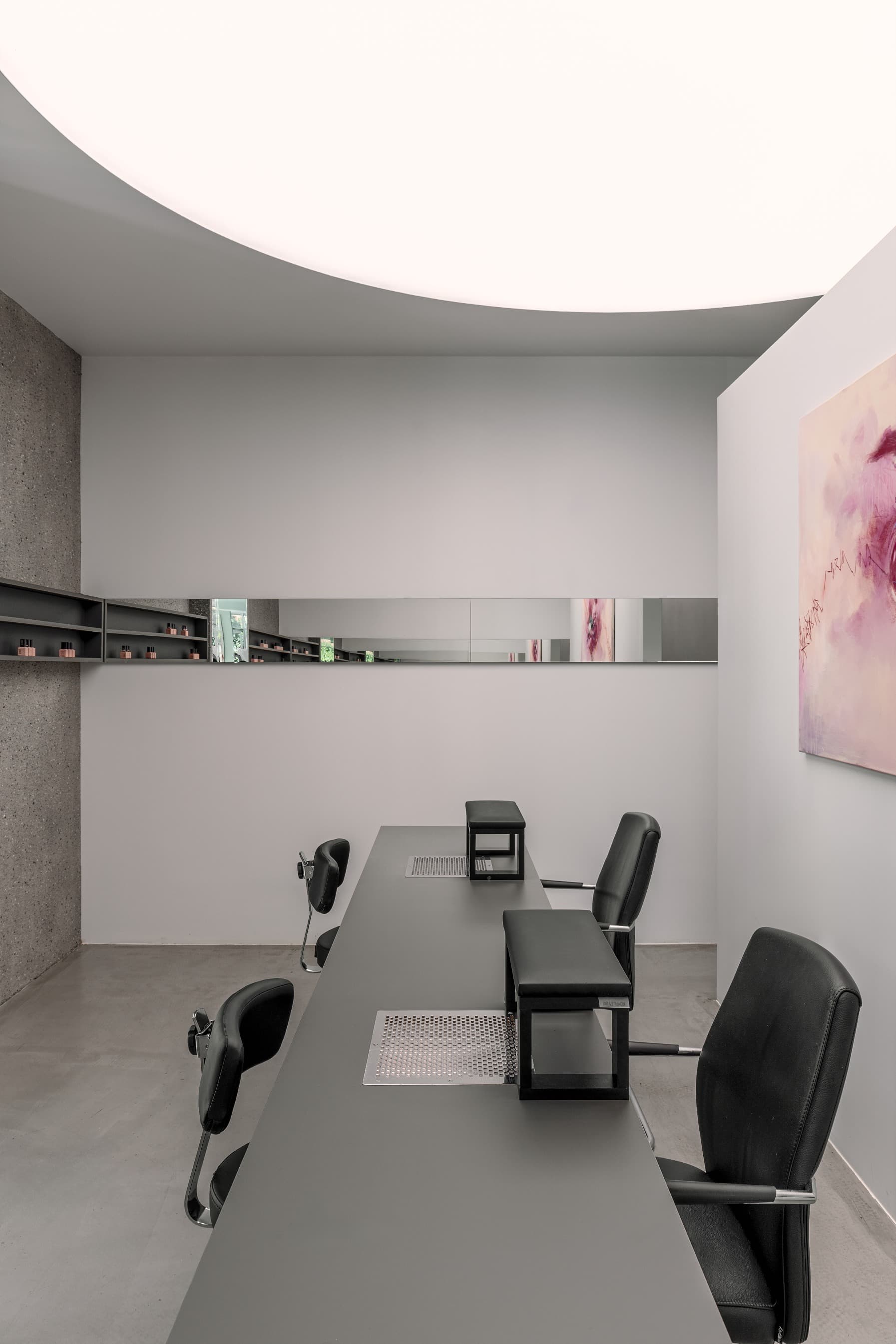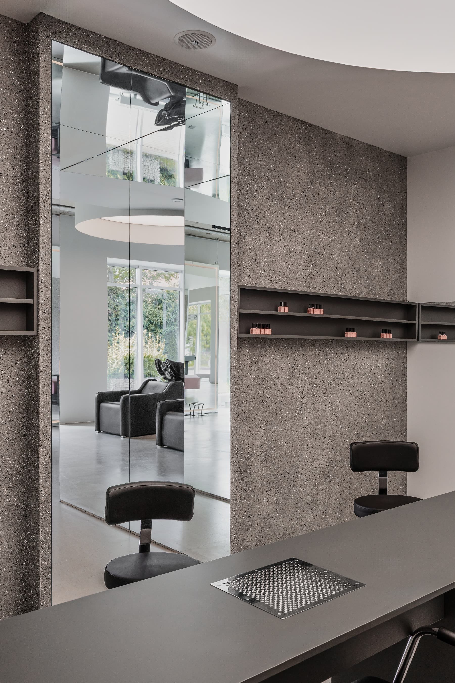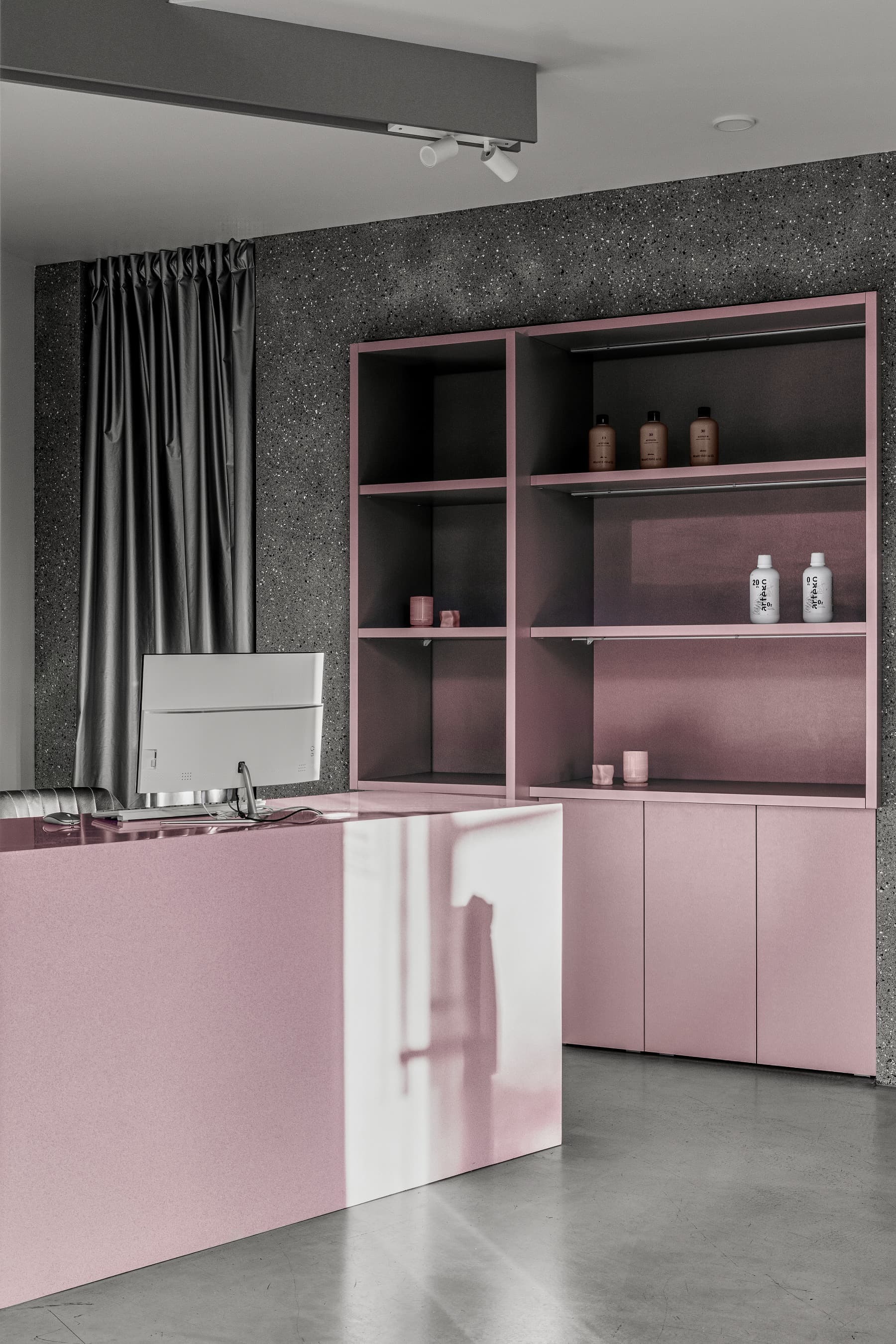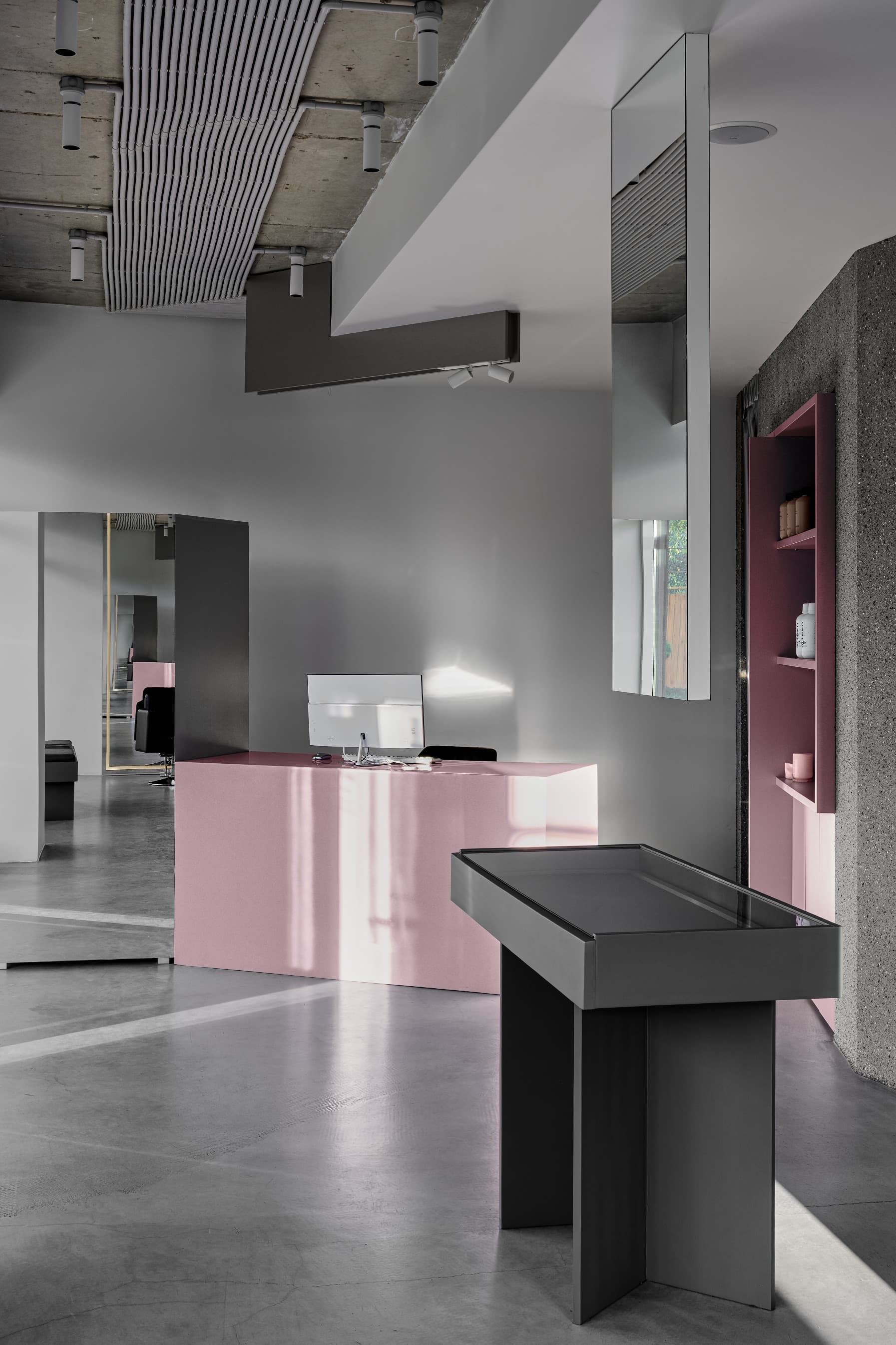 «Объём, пропитанный зеркальными поверхностями, стирает границы между внешним и внутренним пространством. Через зеркальный коридор можно попасть в отдельное пространство для маникюра и педикюра. Планировка создаёт динамичный ритм, перемещая посетителя от входа в интерьер пространства. Этот поток, как ураган, последовательно обнажает основные элементы салона: ресепшн, витрину с украшениями, розовый диван и фотозону».