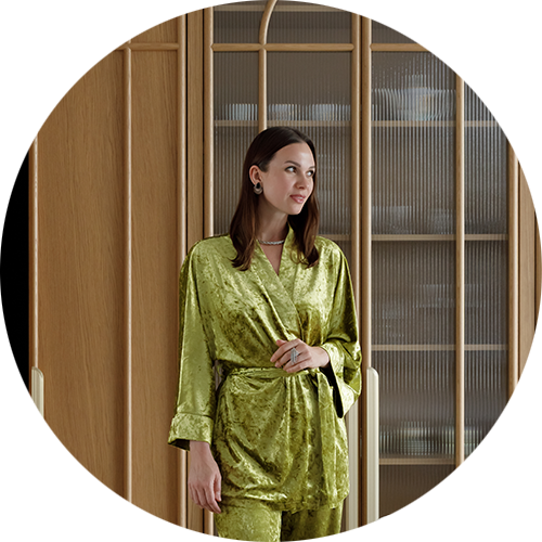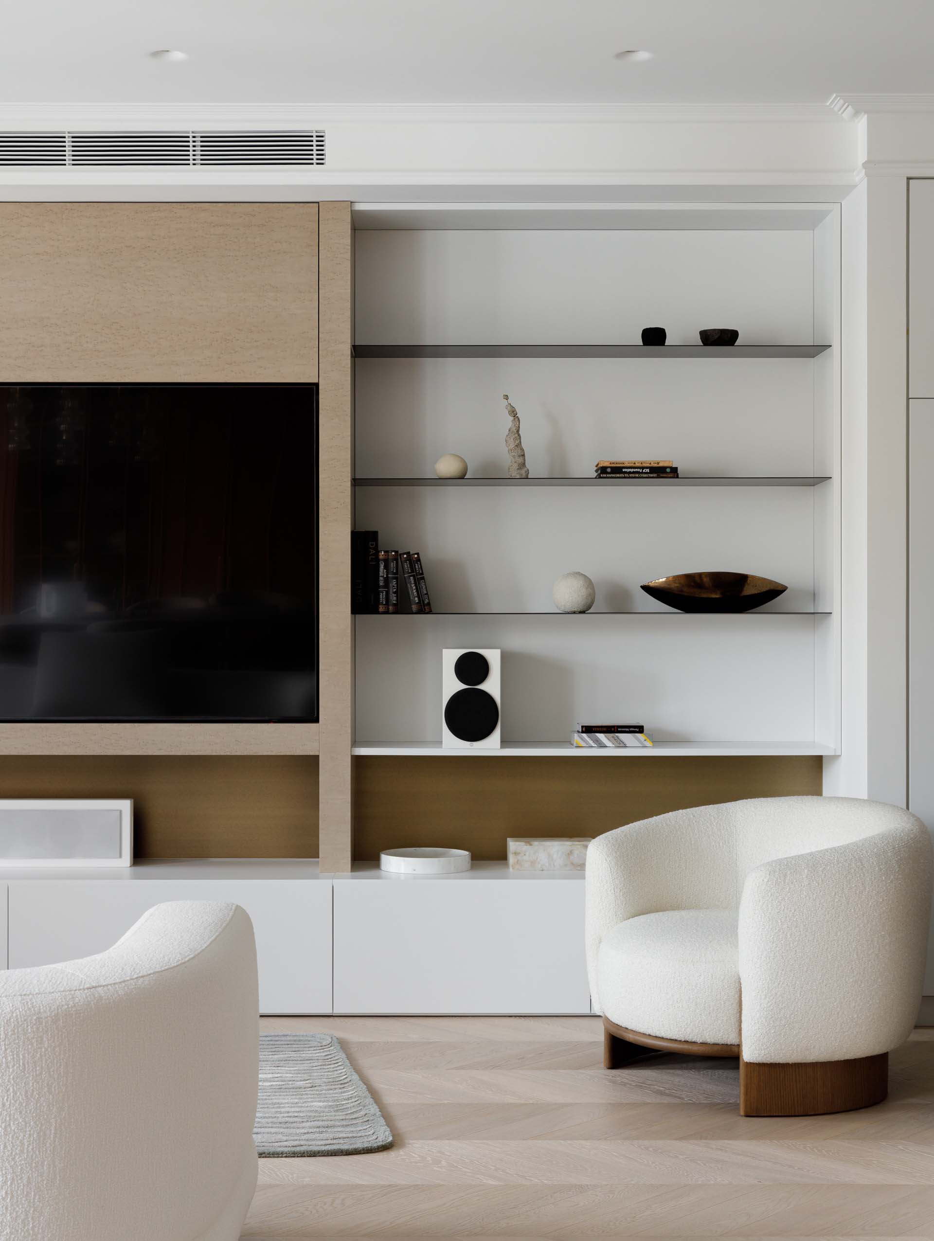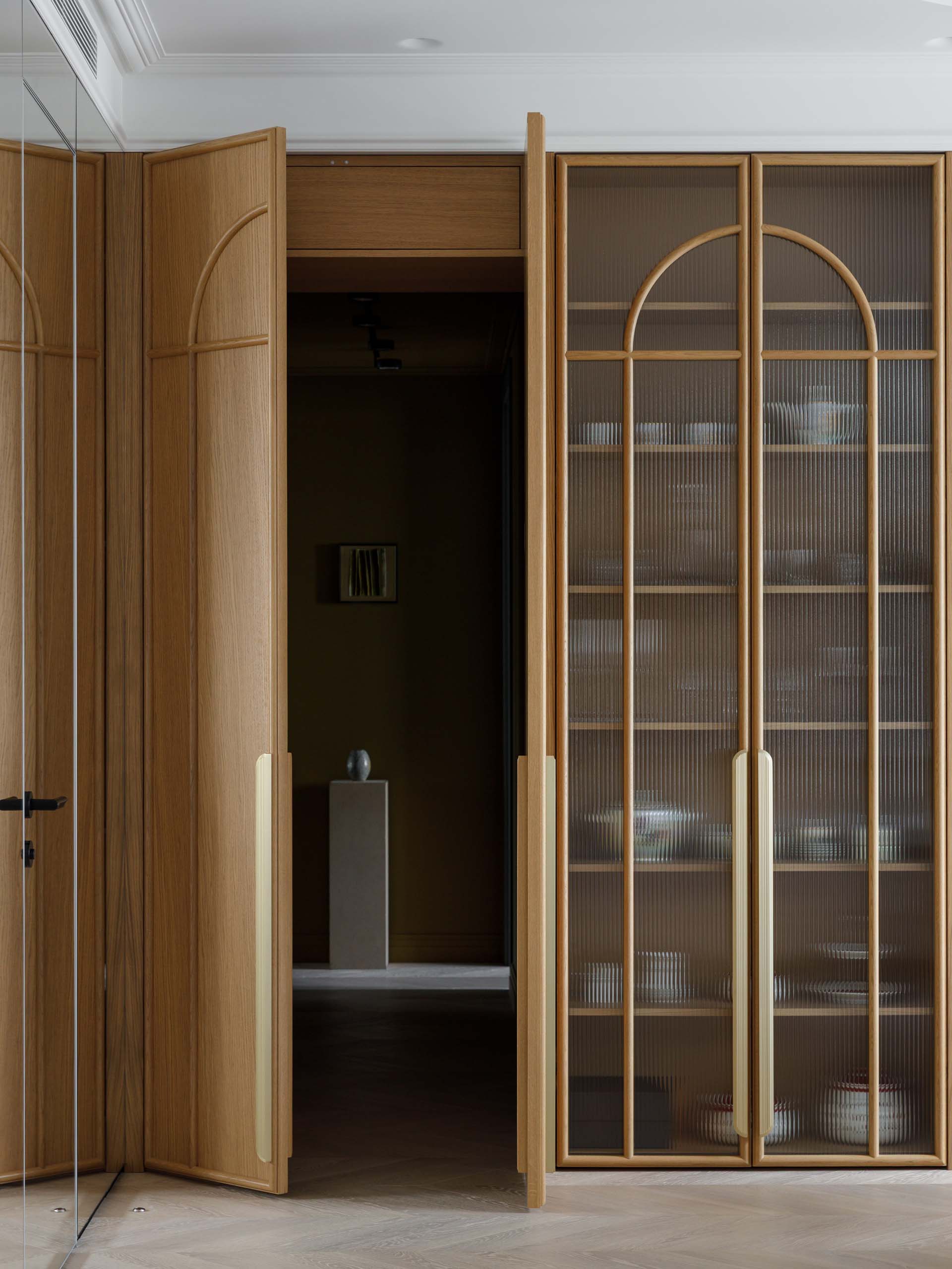 «И одним из самых необычных решений стал шкаф с изогнутыми дверцами и рифленым стеклом. За ним мы разместили всю приватную зону квартиры: две двери распахнулись, открывая тайный вход и коридор, ведущий в спальни. Мы долго кропотливо просчитывали пропорции и детали. Благодаря нашим опытным мебельщикам нам удалось блестяще воплотить нашу идею в жизнь!»