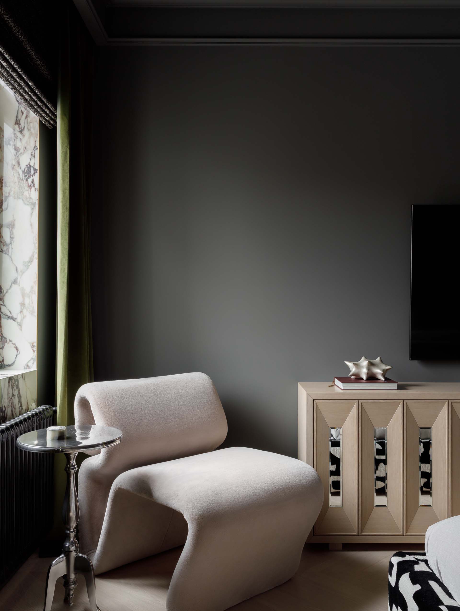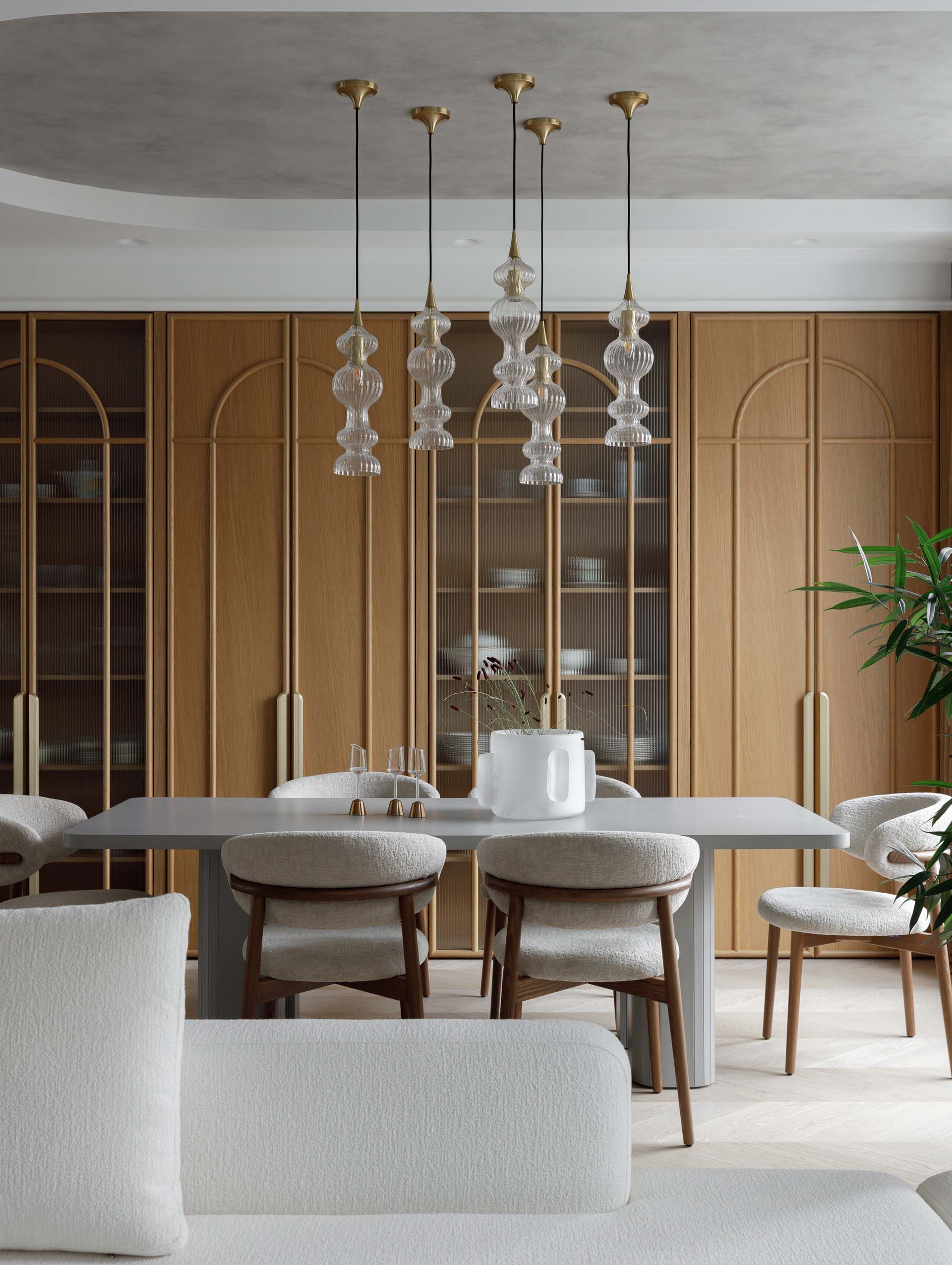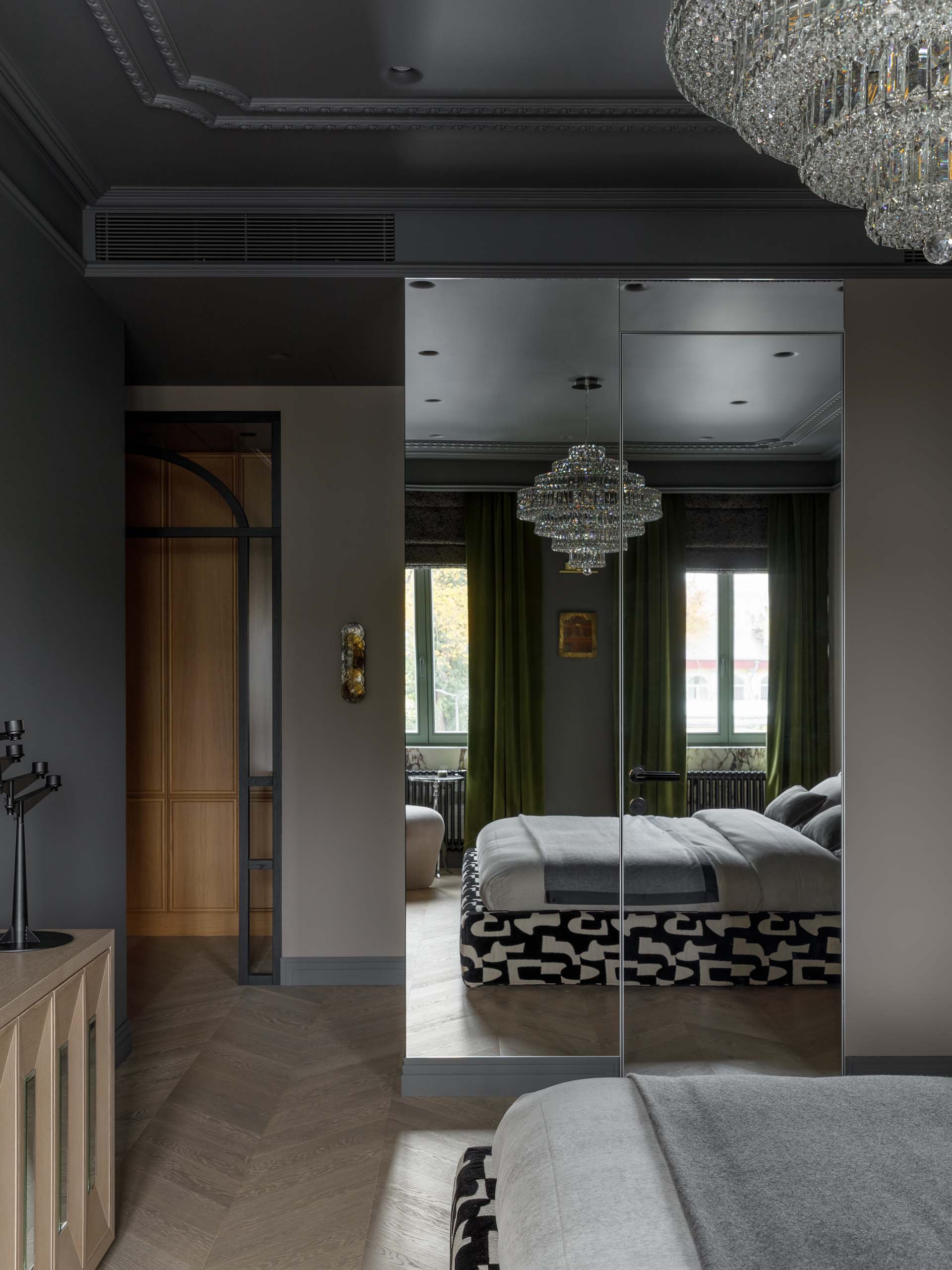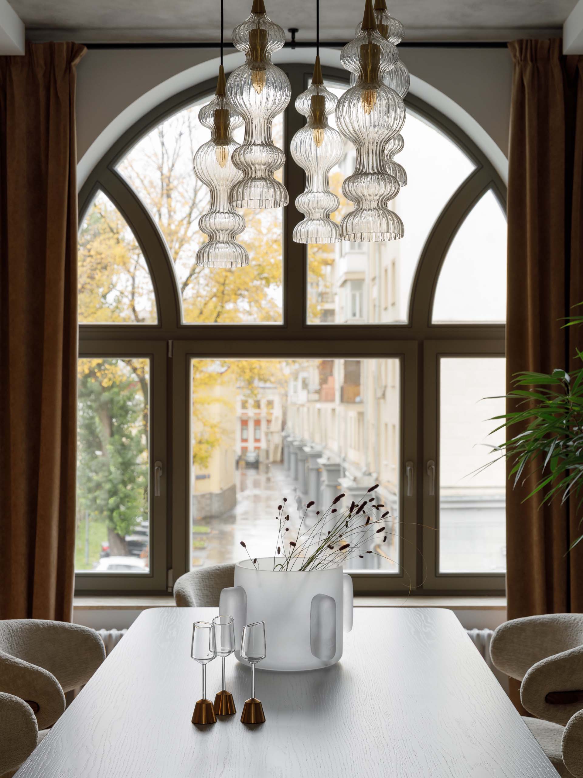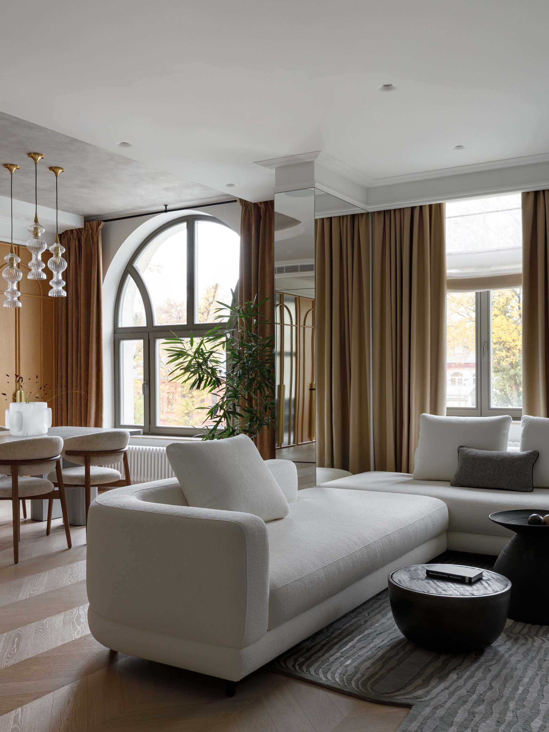 «В квартире много окон, одно из которых имеет арку — это отчасти задает тон интерьеру», — говорит Валерия. — Если в доме, где сейчас живут заказчики, преобладают темные тона, то в городской квартире им хотелось больше света, цвета и легкости. А еще классические детали, хрусталь, винтажная мебель, лепнина, которые должны были «подружиться» с современным интерьером».