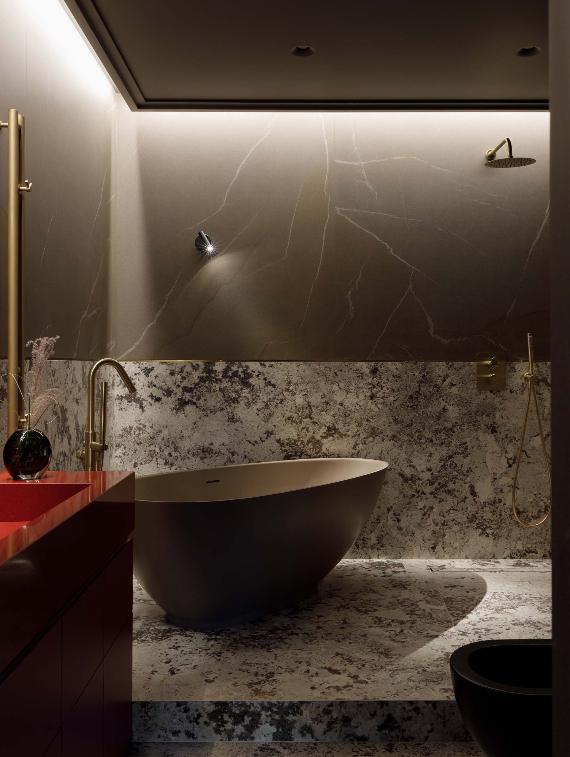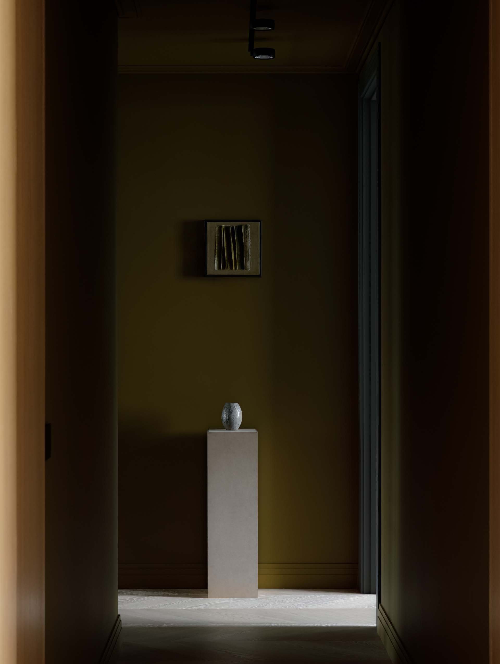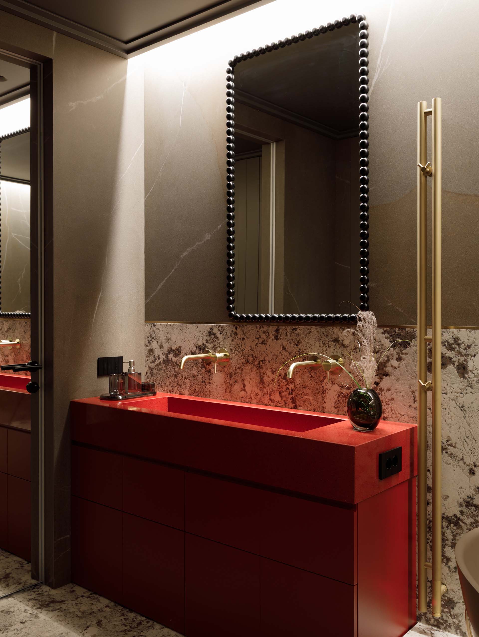 Команда проекта провела масштабную перепланировку: с левой стороны квартиры второй подъезд заложили кирпичом, создав приватное пространство со спальнями, гардеробной, санузлами и подсобным помещением. Площадь второй квартиры справа была отведена под кухню-гостиную, гостевой санузел, гардеробную и прихожую.