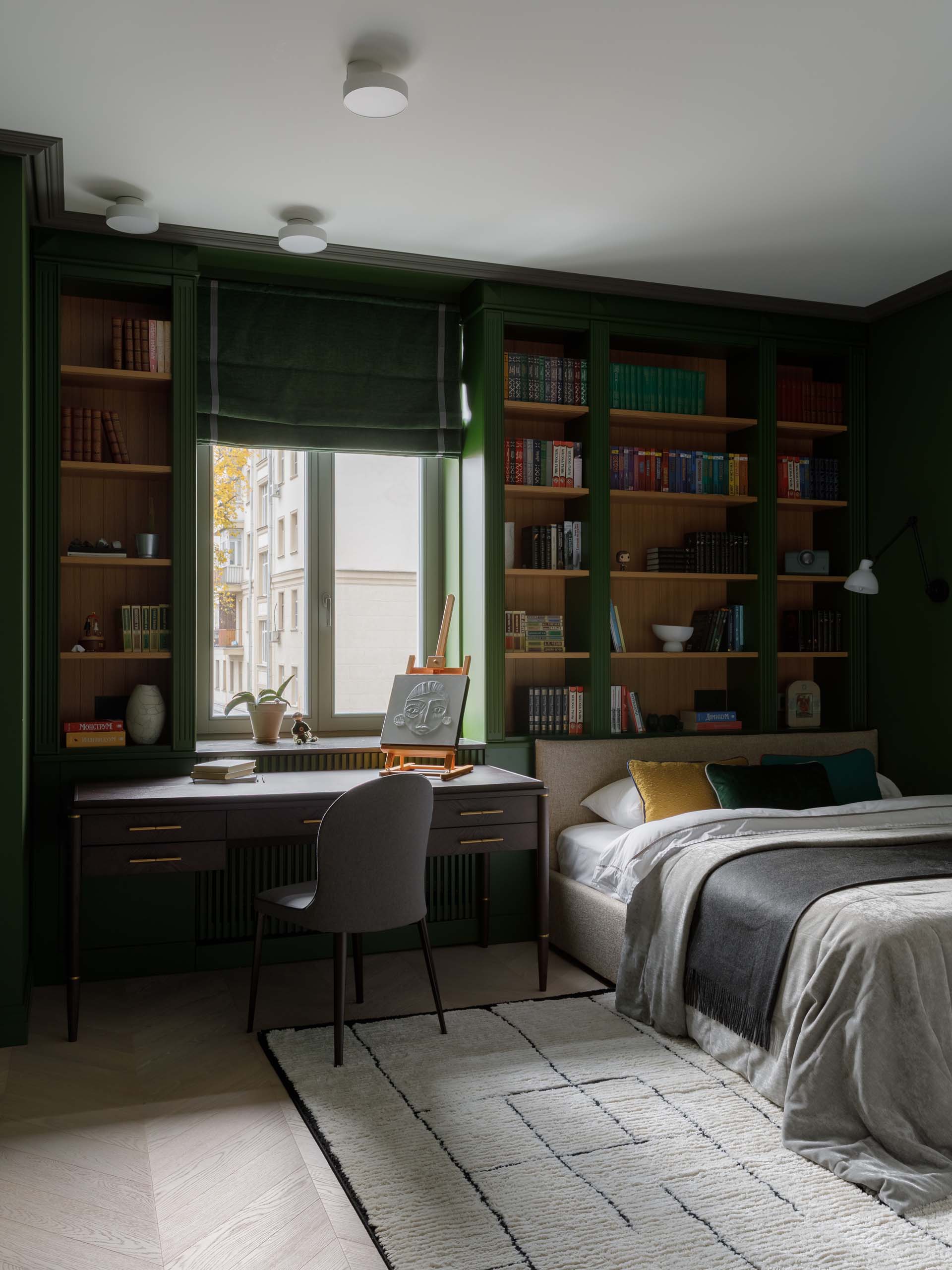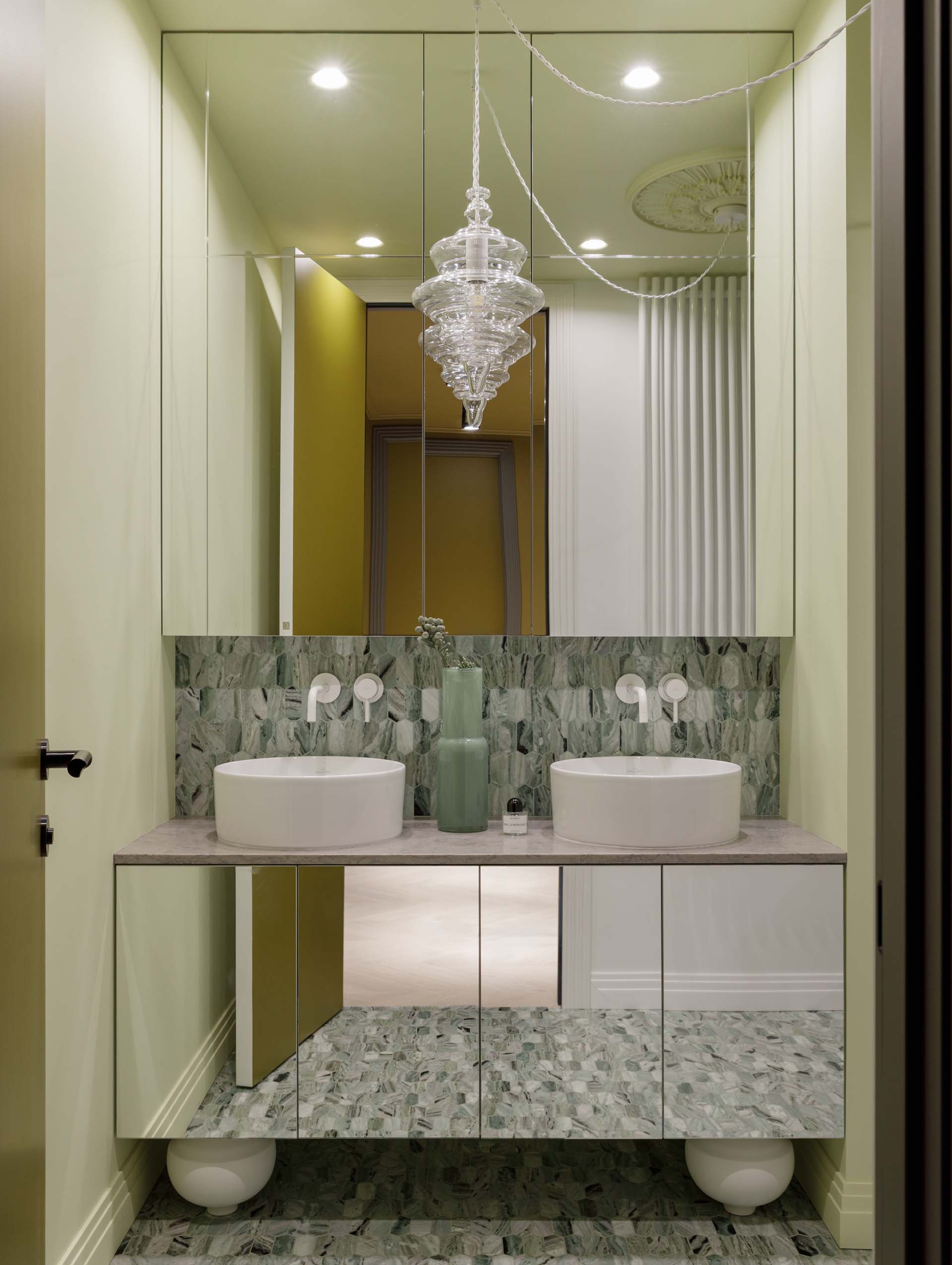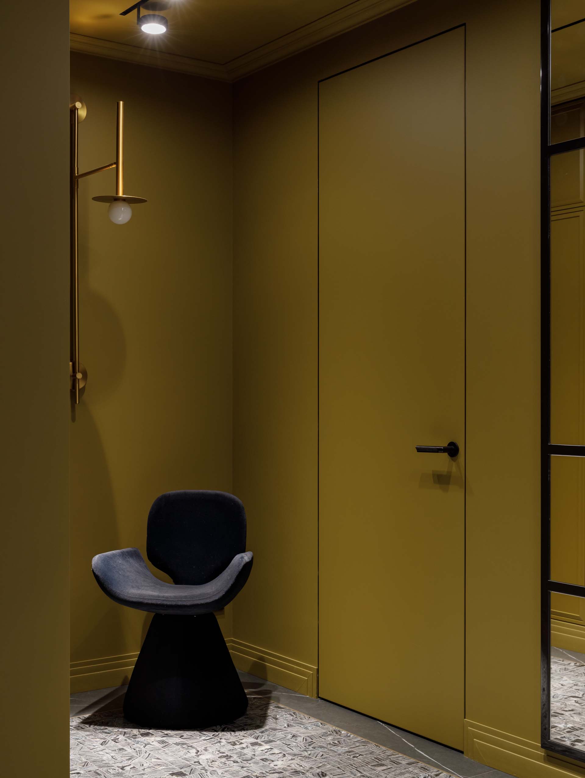 «Для основных комнат мы выбрали молочно-белый цвет в сочетании с горчичным, кухня-гостиная — светлая и светлая. Хозяева хотели, чтобы хозяйская спальня была темной, в приглушенных тонах: здесь мы сочетали кофейно-серые тона стен и потолка с бархатными шторами оливкового цвета. Детская комната старшей дочери окрашена в насыщенный зеленый цвет, а у младшей — едва заметный мятный цвет. Цвета в ванных комнатах также сложные: сливовый на потолке в гостевом санузле, канареечный в сочетании с изумрудная мозаика в детской, кофе с рубином в спальне».