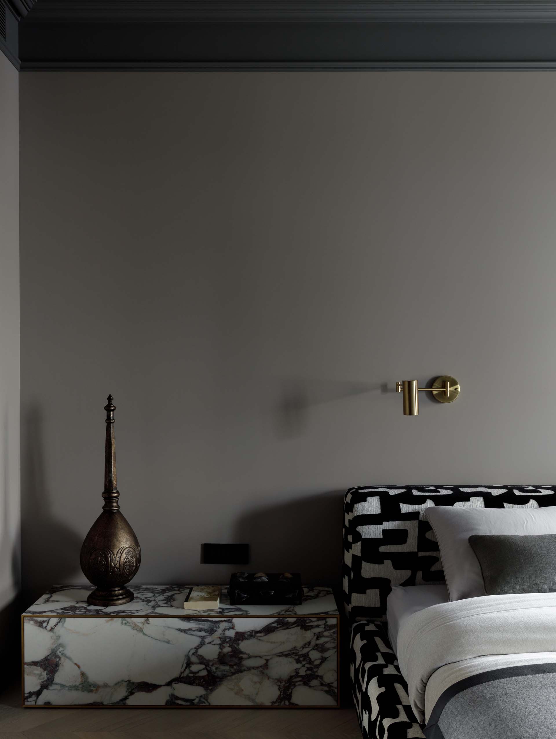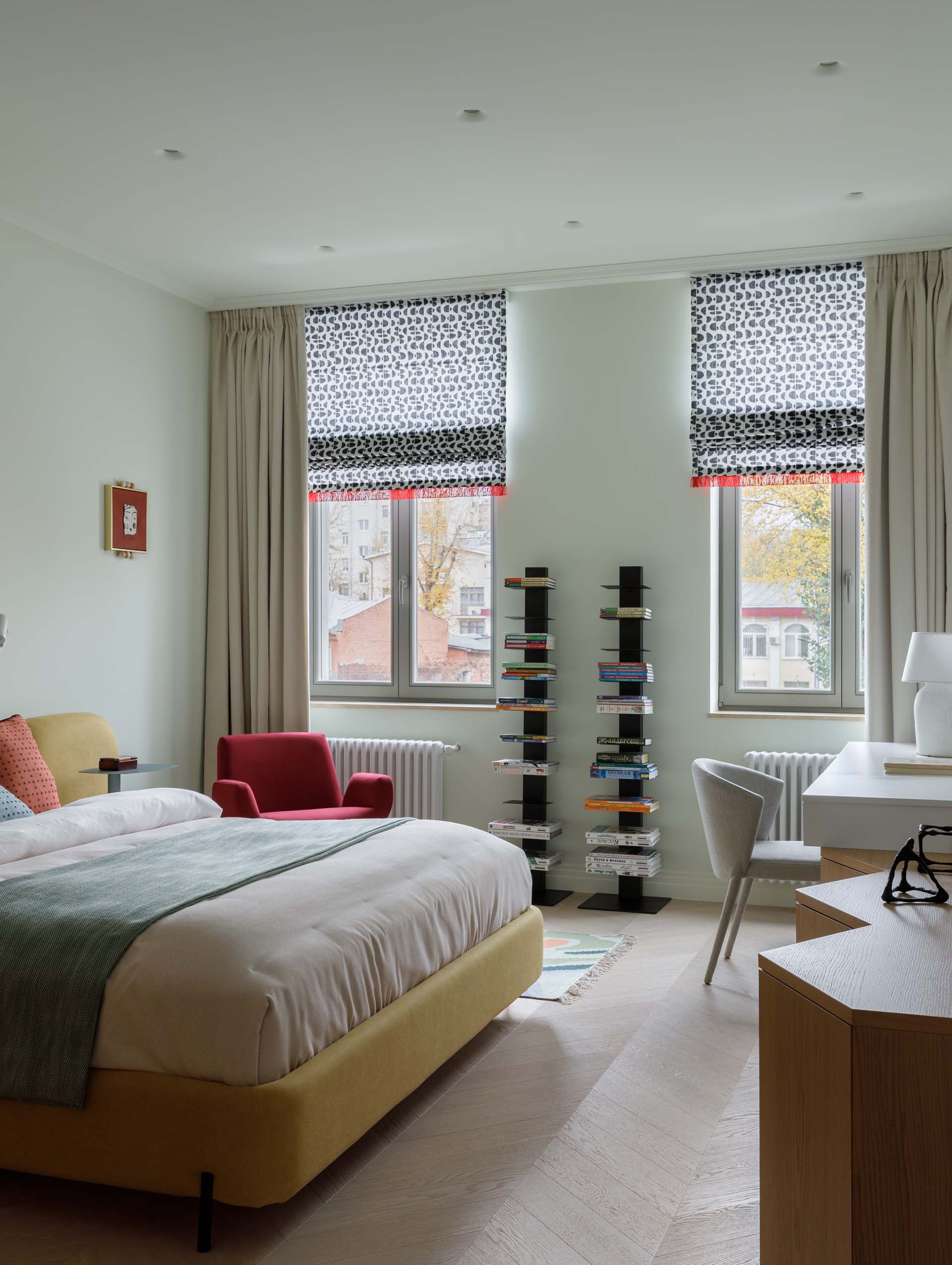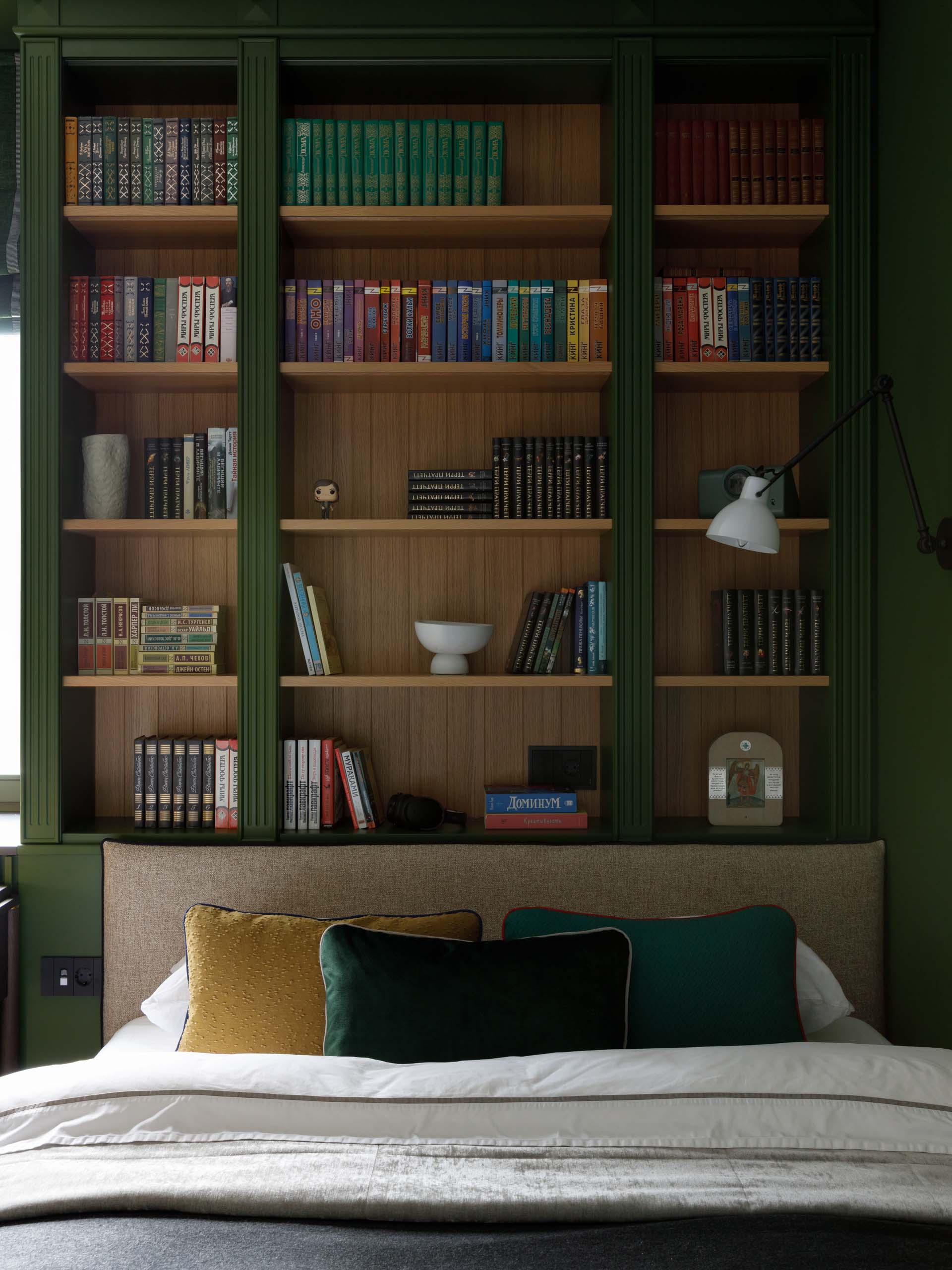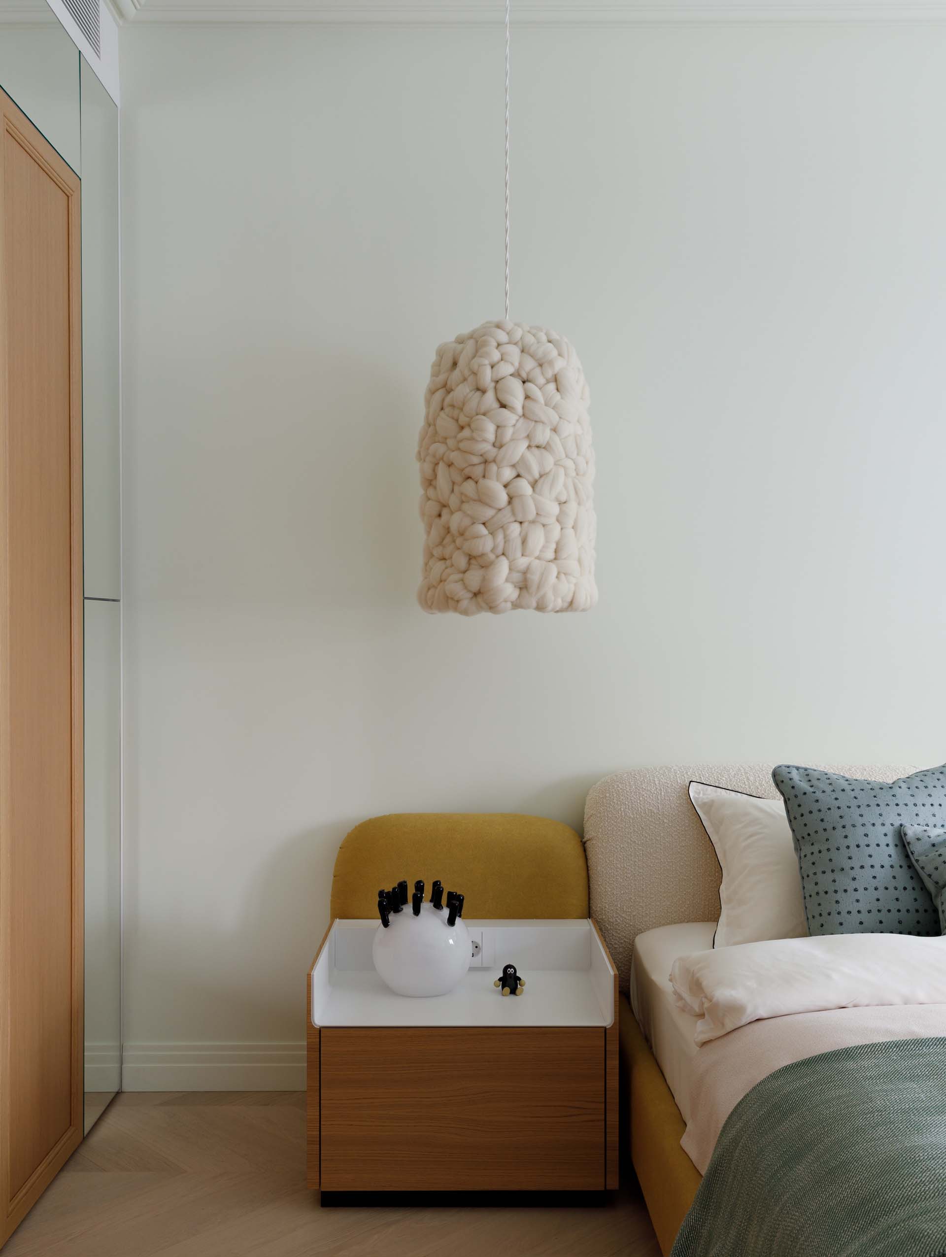 «Для основных комнат мы выбрали молочно-белый цвет в сочетании с горчичным, кухня-гостиная — светлая и светлая. Хозяева хотели, чтобы хозяйская спальня была темной, в приглушенных тонах: здесь мы сочетали кофейно-серые тона стен и потолка с бархатными шторами оливкового цвета. Детская комната старшей дочери окрашена в насыщенный зеленый цвет, а у младшей — едва заметный мятный цвет. Цвета в ванных комнатах также сложные: сливовый на потолке в гостевом санузле, канареечный в сочетании с изумрудная мозаика в детской, кофе с рубином в спальне».