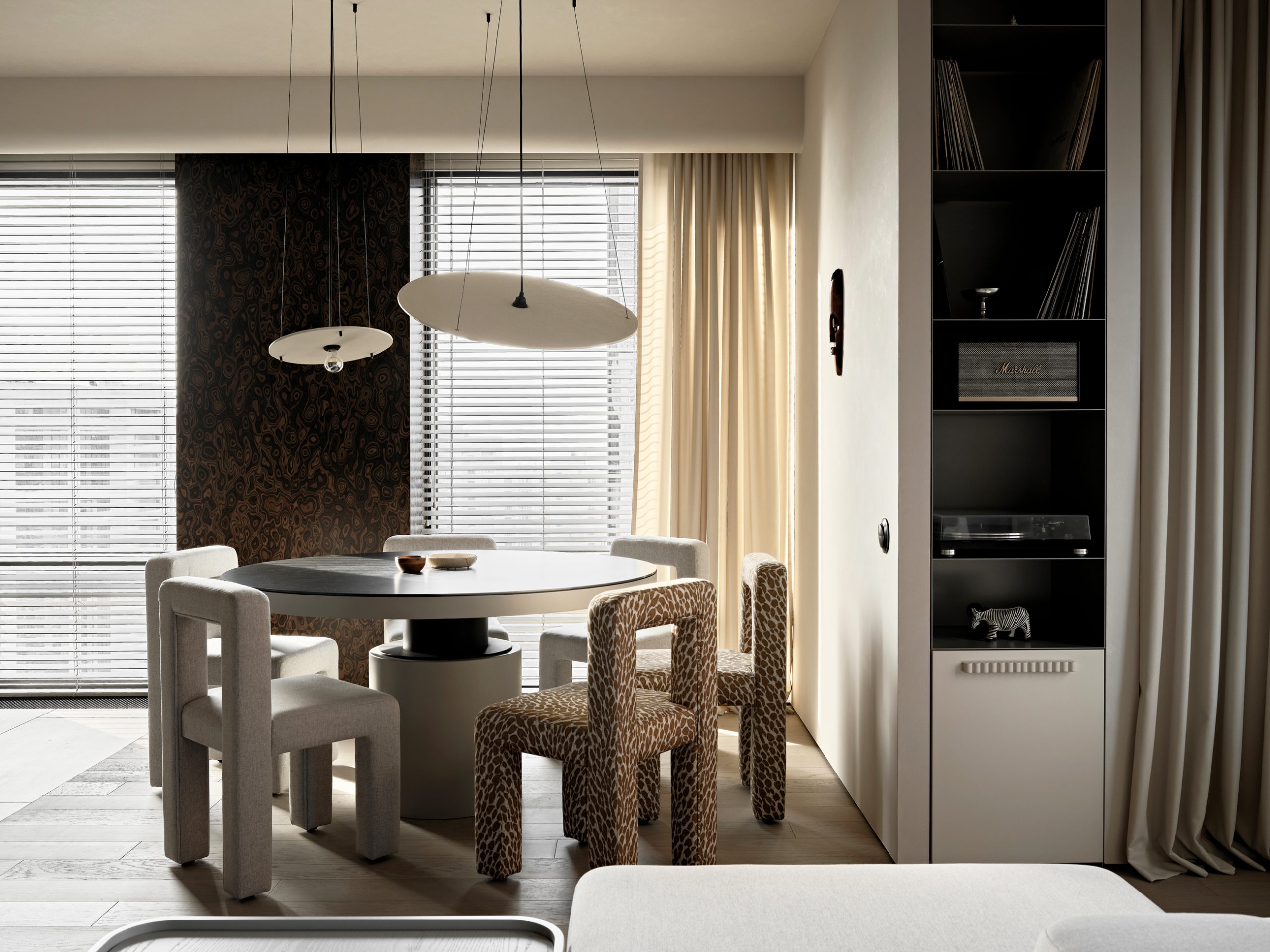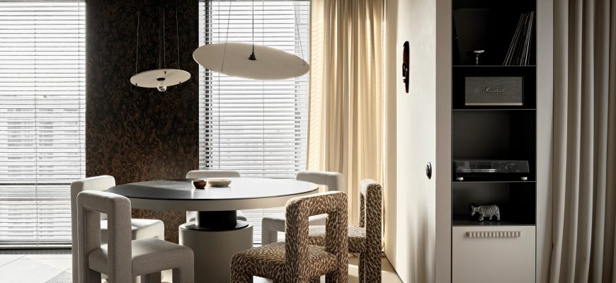 Площадь квартиры – 135 квадратных метров. В планировке застройщика уже было логичное и грамотное зонирование, поэтому команда проекта практически не меняла базовую планировку помещений, а сосредоточилась на работе с геометрией, пластикой форм и пространственными ощущениями. «Это теплая и спокойная интерпретация стиля Джапанди, дополненная африканскими акцентами», — говорит Илья. «Мы постарались создать интерьер, в котором природная пластика становится частью архитектуры».