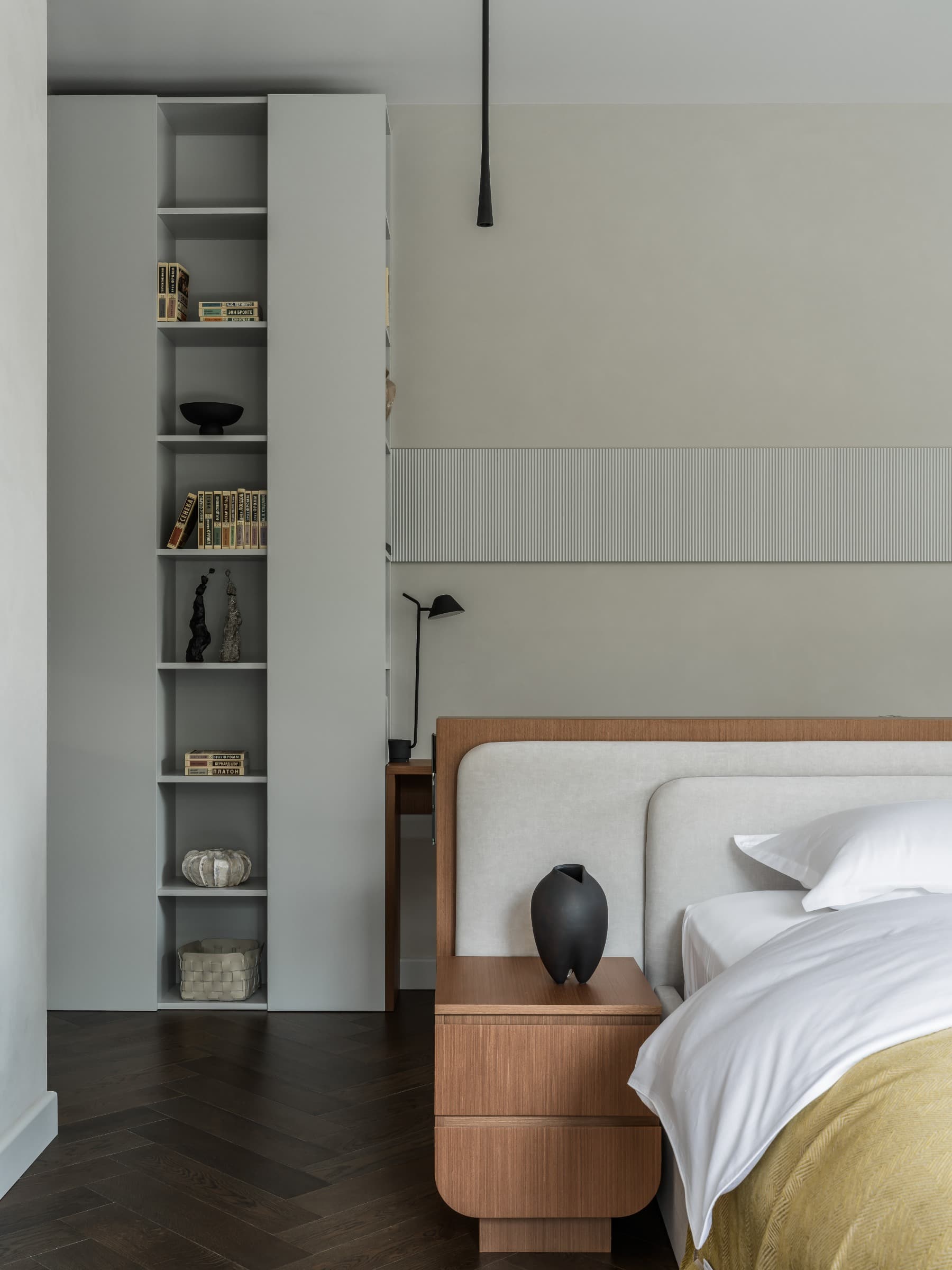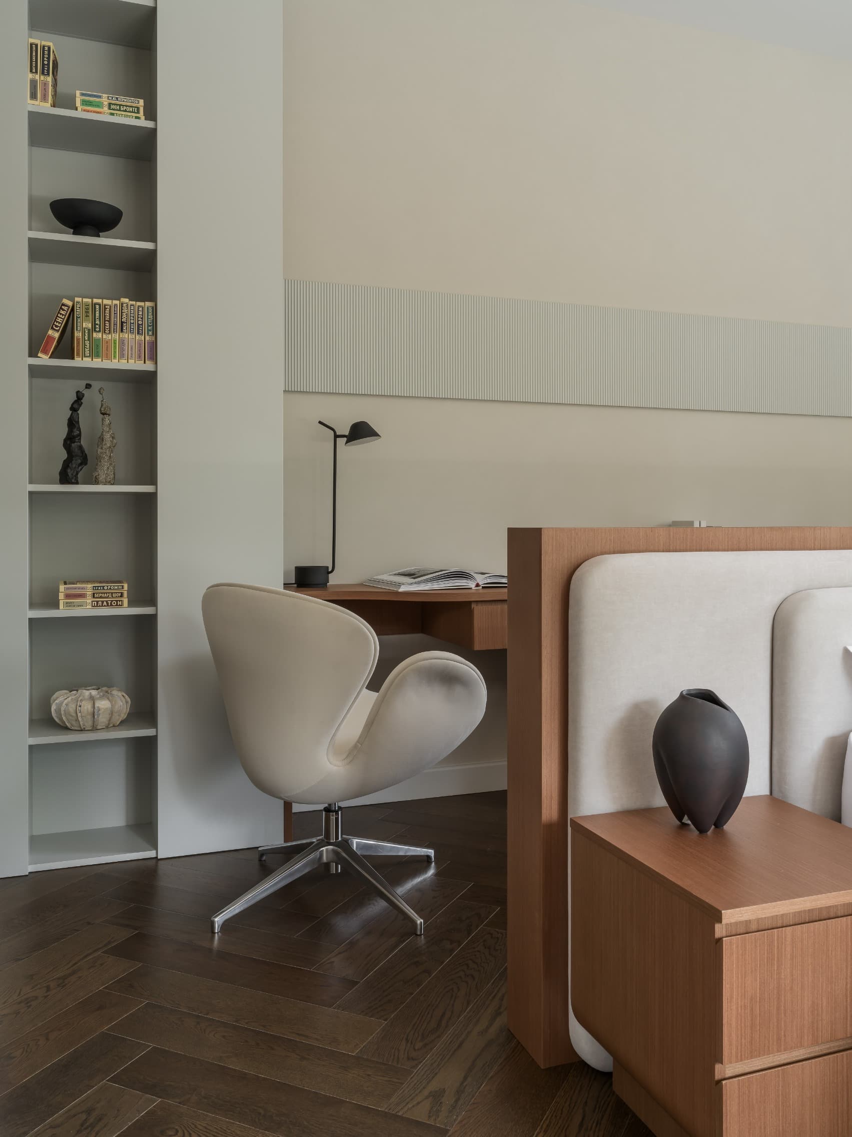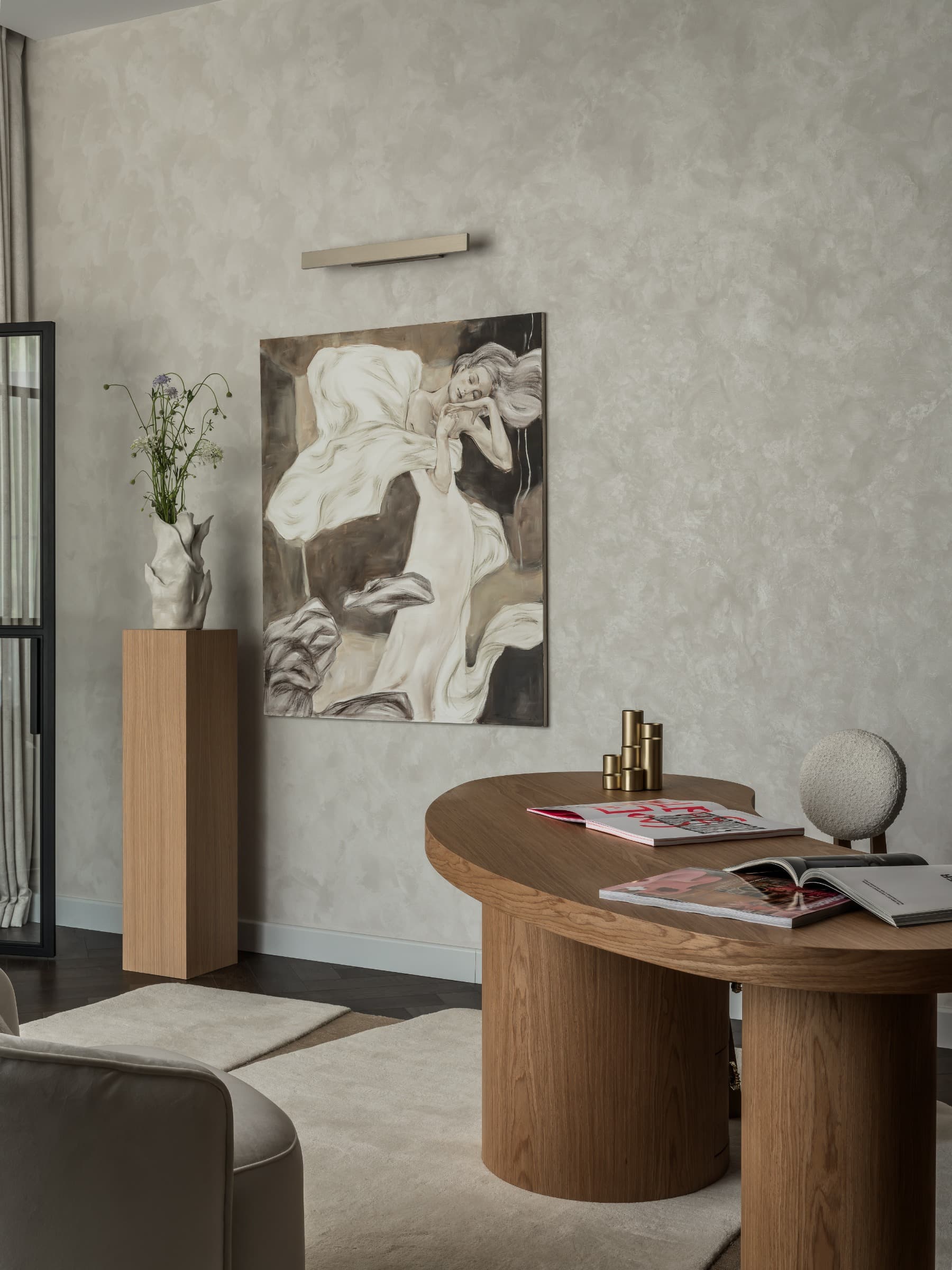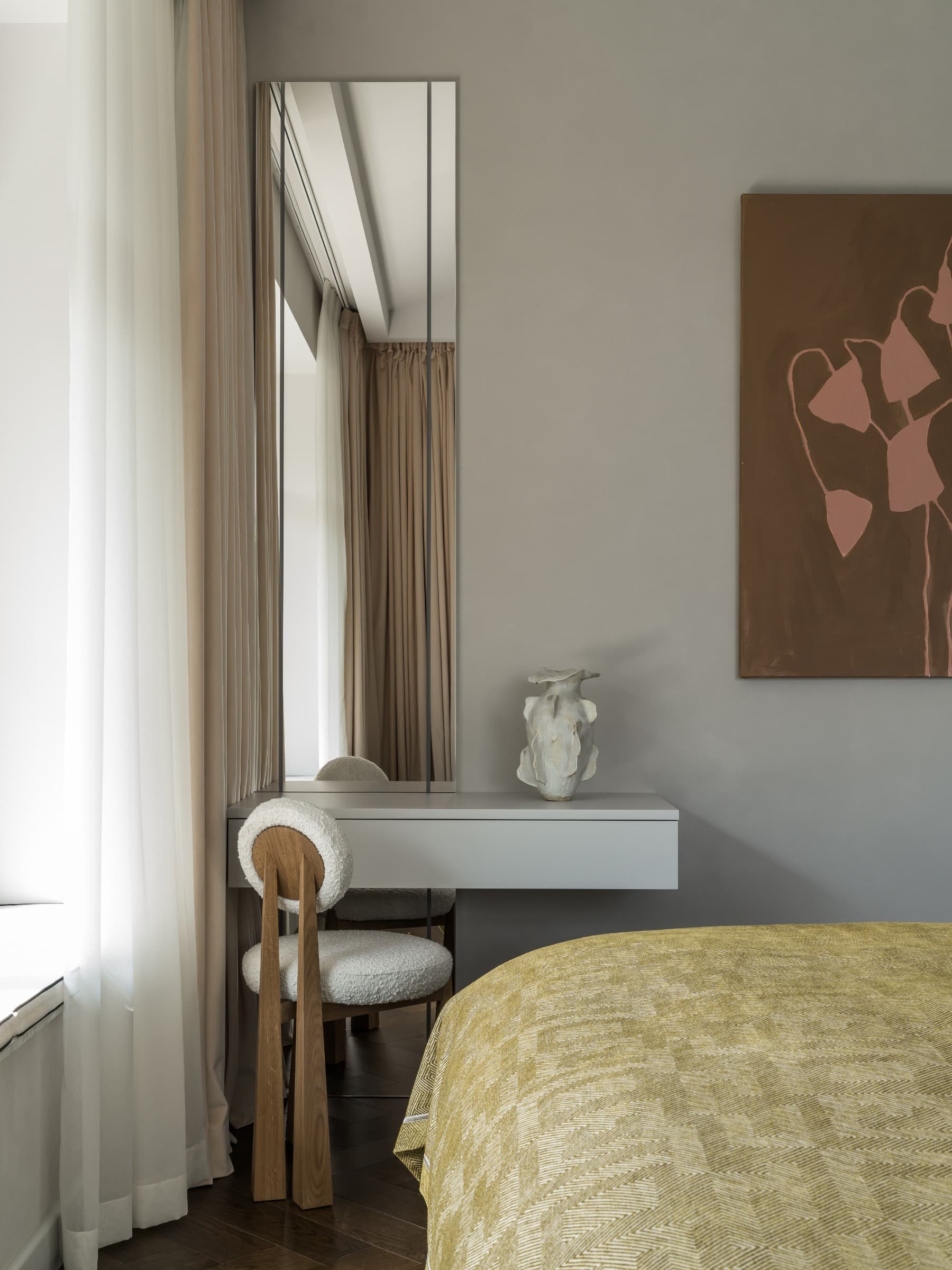 «Цветовая палитра сложилась естественно – заказчики предпочитают светлые тона, поэтому мы взяли за основу пудровые оттенки и добавили несколько светлых цветовых акцентов. Особой гордостью проекта стала мебель, большая часть которой была изготовлена по моим эскизам – таких тумбочек, комодов или письменных столов вы больше нигде не найдете. Особенно мне нравится комод в столовой: он покрыт темным шпоном, а многоуровневые фасады отбрасывают невероятные тени, создавая сложный объем».