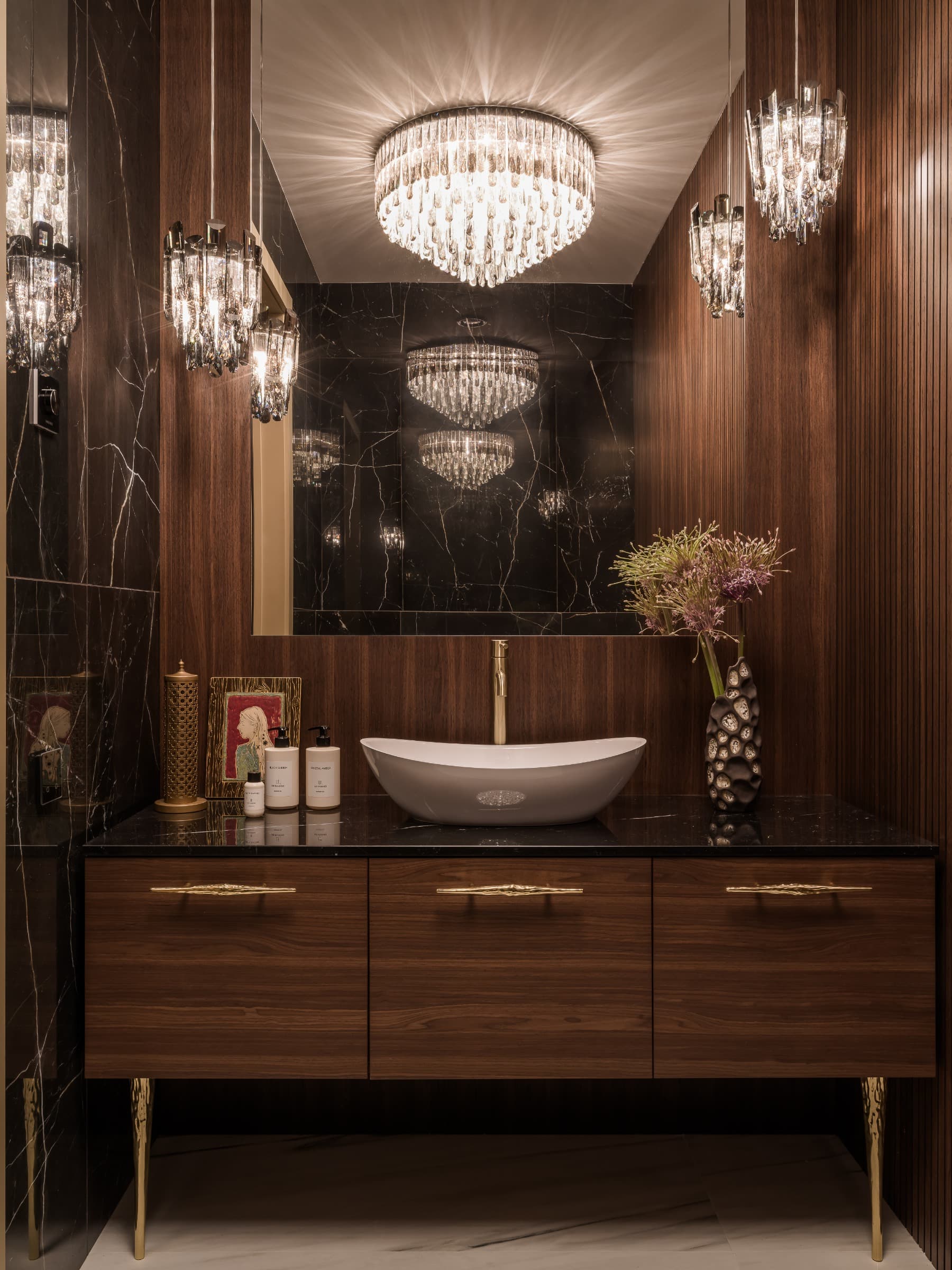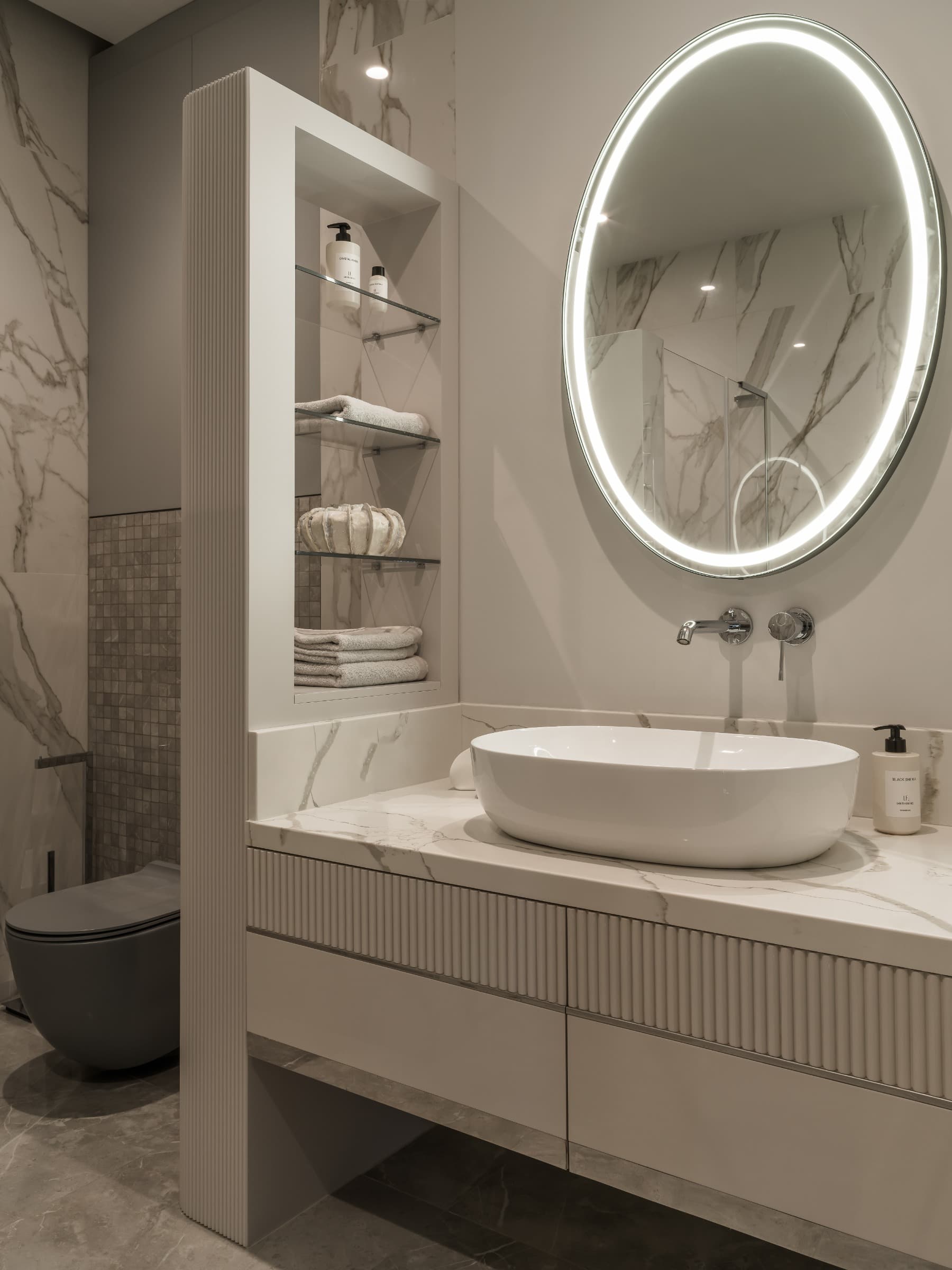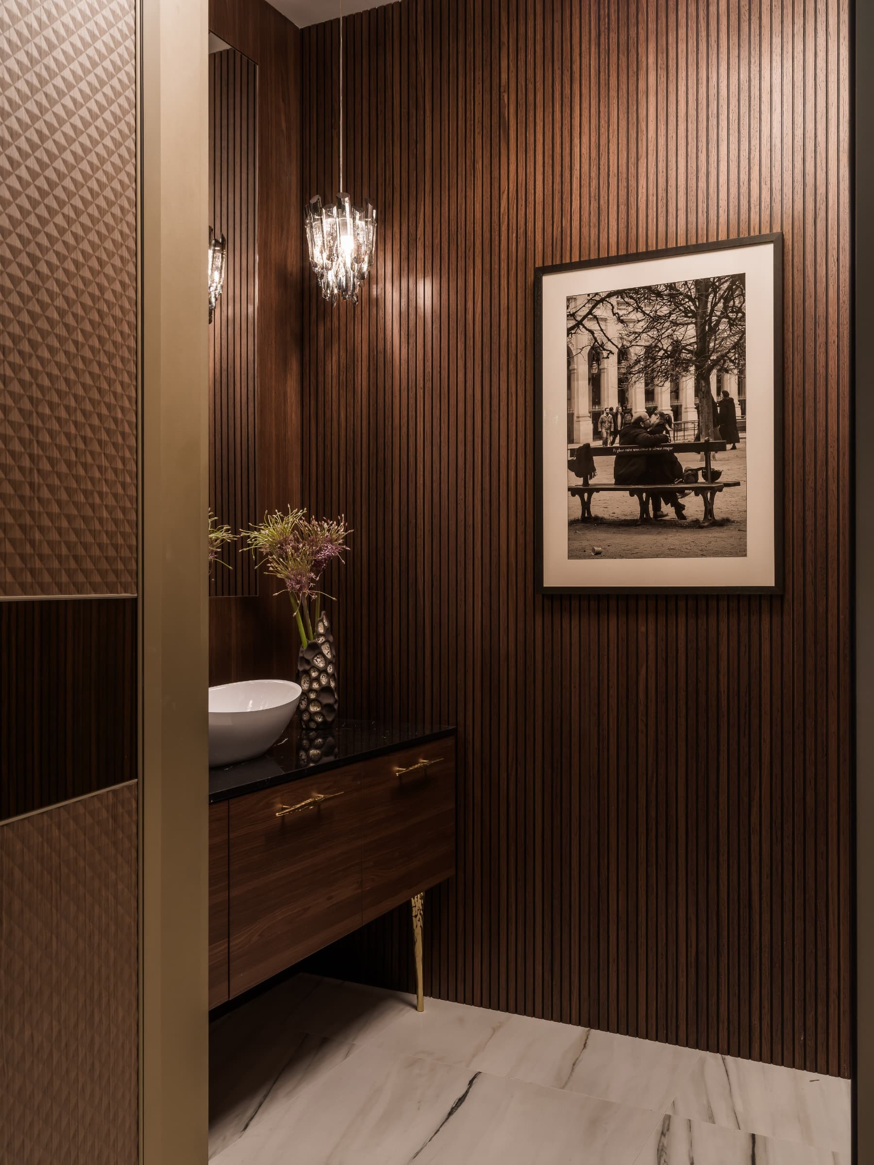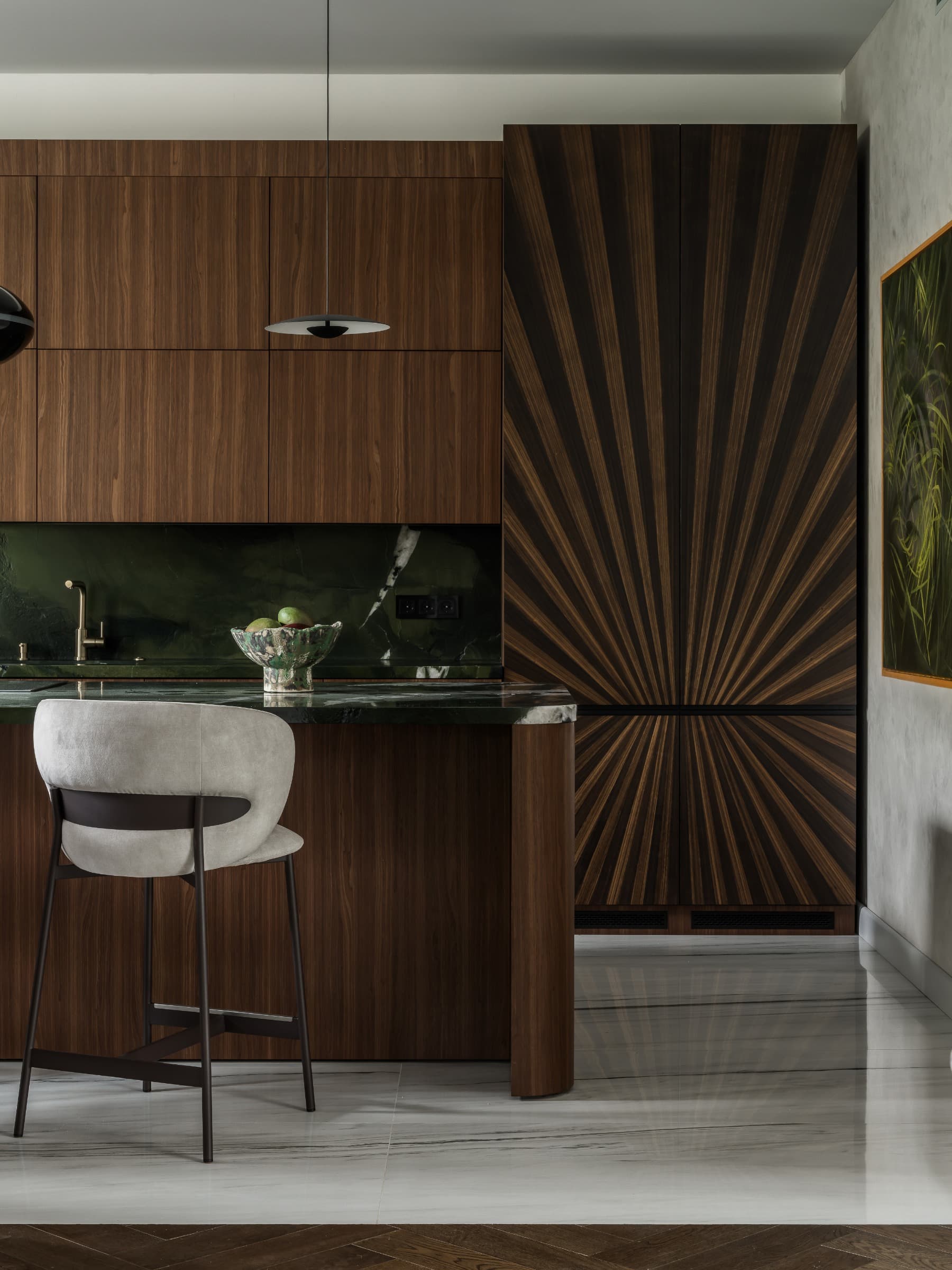 «Цветовая палитра сложилась естественно – заказчики предпочитают светлые тона, поэтому мы взяли за основу пудровые оттенки и добавили несколько светлых цветовых акцентов. Особой гордостью проекта стала мебель, большая часть которой была изготовлена по моим эскизам – таких тумбочек, комодов или письменных столов вы больше нигде не найдете. Особенно мне нравится комод в столовой: он покрыт темным шпоном, а многоуровневые фасады отбрасывают невероятные тени, создавая сложный объем».