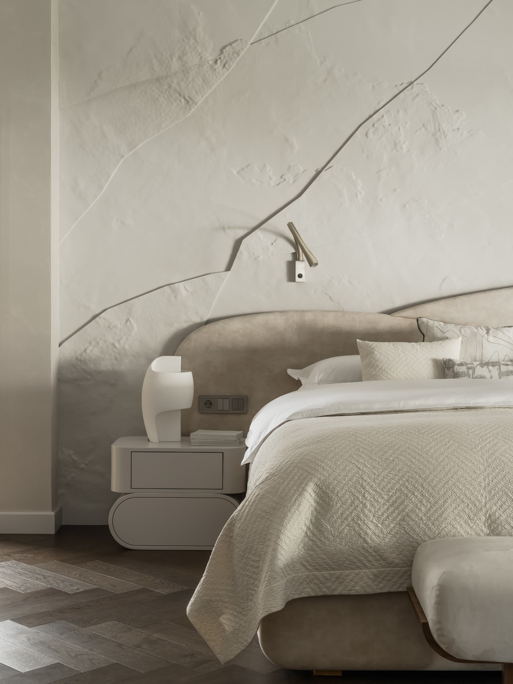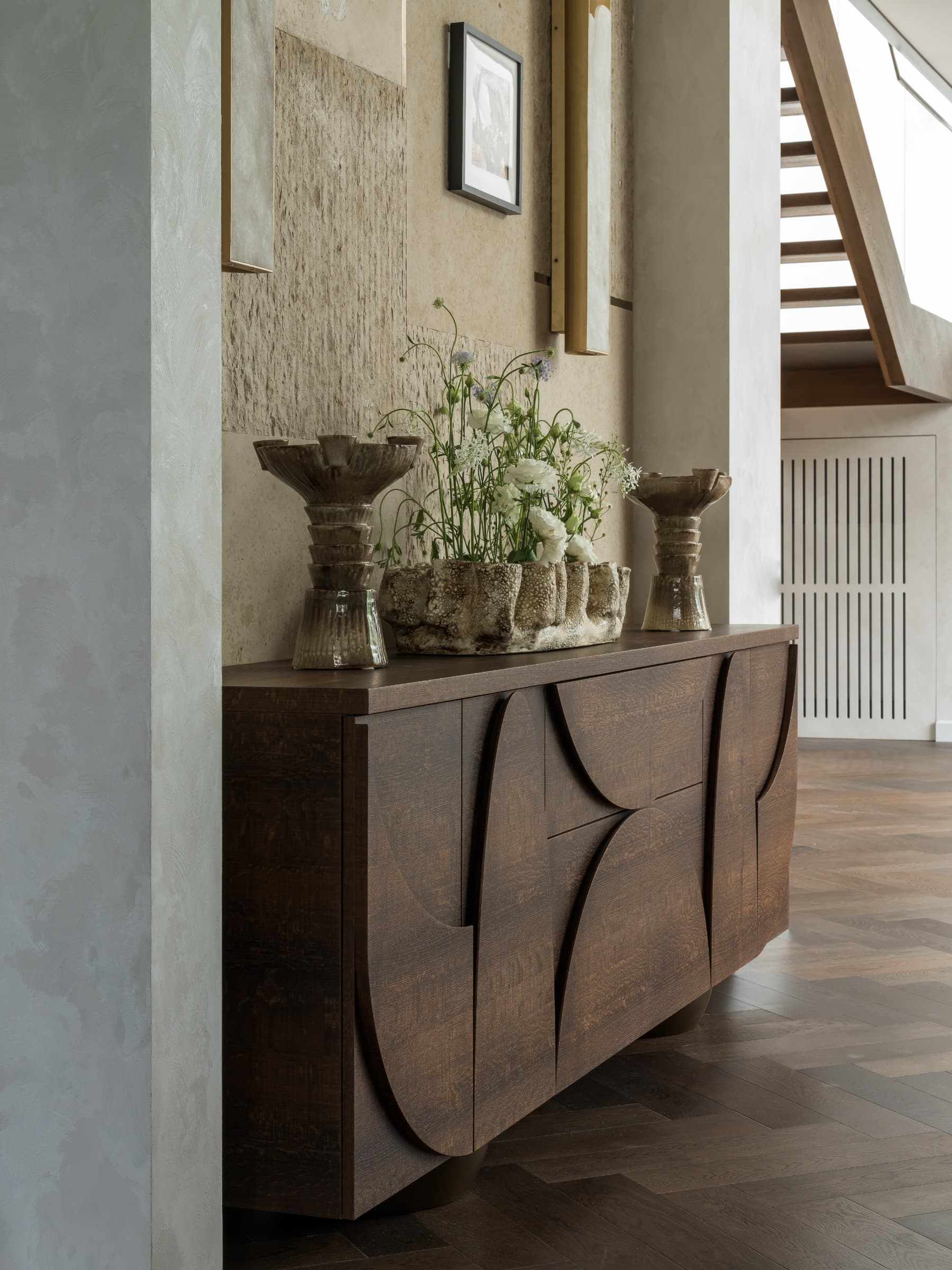 «Моей главной целью было привнести индивидуальность в этот дом, создать привлекательную и комфортную среду для проживания и встреч с друзьями. Мы стремились создать пространство, в котором красота и функциональность дополняют друг друга. В отделке акцент был сделан на тактильность и натуральные материалы. Большая часть стен покрыта матовой декоративной штукатуркой, напоминающей мягкую замшу. Мне очень нравится выбранная для кухни сланцевая плитка: неровная поверхность с шагреневым эффектом в сочетании с темным шпоном выглядит особенно выразительно. главная спальня украшена гипсовым барельефом, который создает ощущение монументальности и чистоты. В столовой мы смонтировали стену из юрского известняка, похожую на тетрис, причем каждая деталь обработана по-разному для создания глубины.