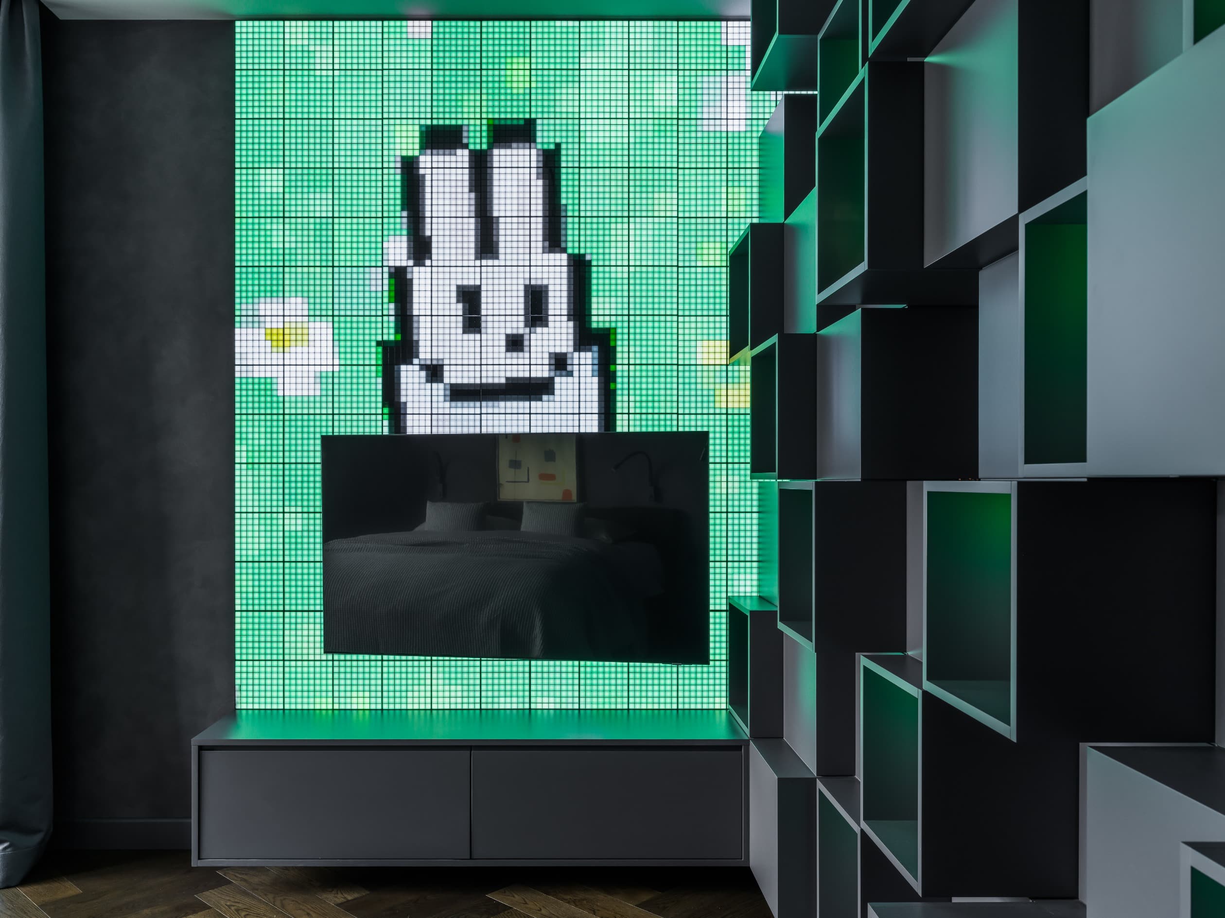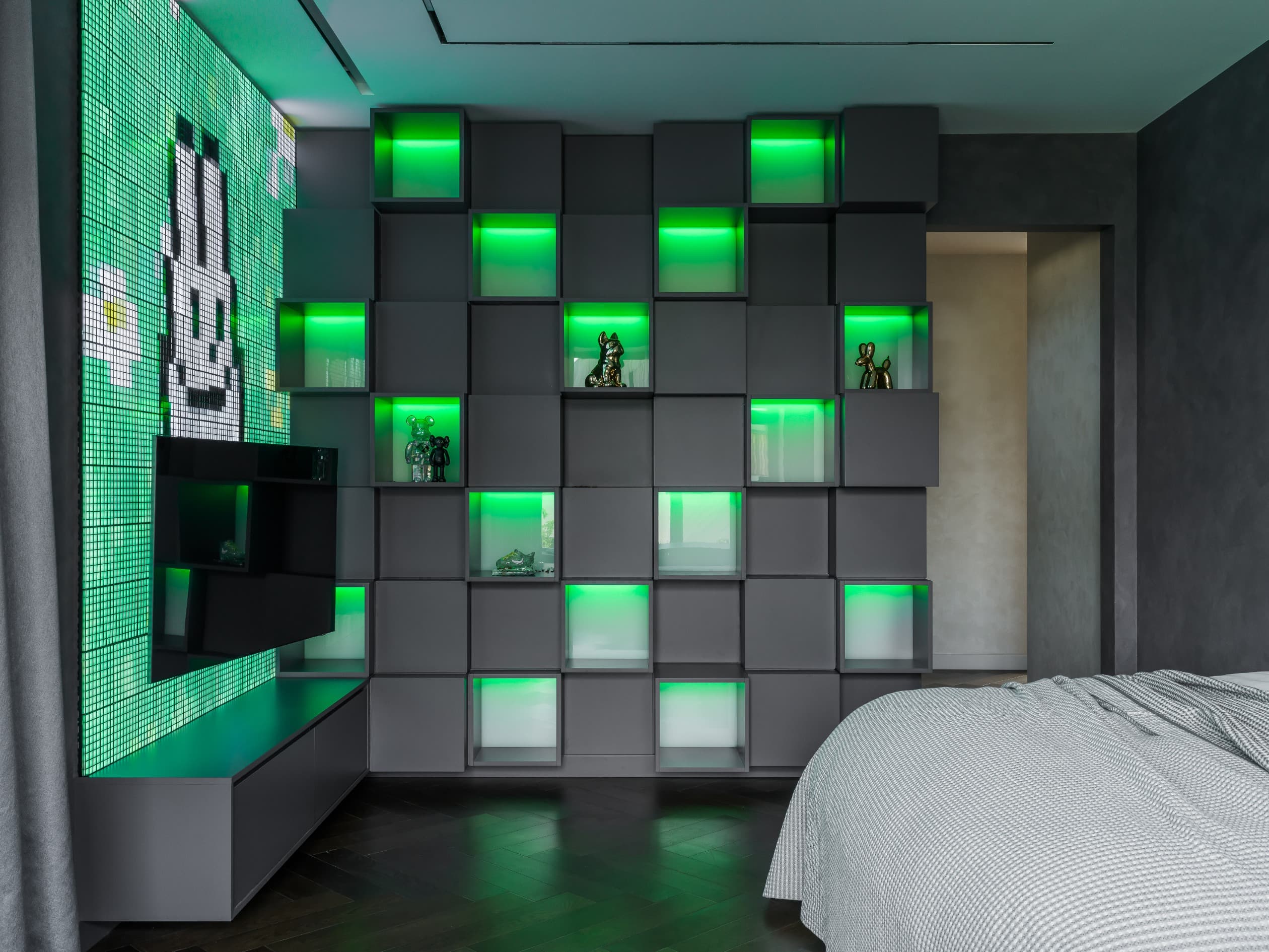 «Поскольку покупатели не любят посторонних запахов, мы установили на кухне две независимые вытяжки: одна интегрирована в варочную панель, другая стандартно расположена над зоной готовки. Также мы подумали о системе «умный дом» с разными сценариями освещения и датчиками движения. В спальне одного из сыновей установлена световая панель, состоящая из 186 деталей. Она может излучать любое изображение, а соседняя стеллаж с подсветкой позволяет раскрасить ниши в разные цвета».