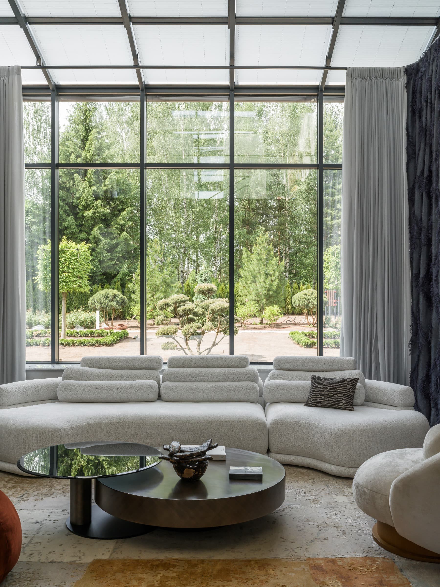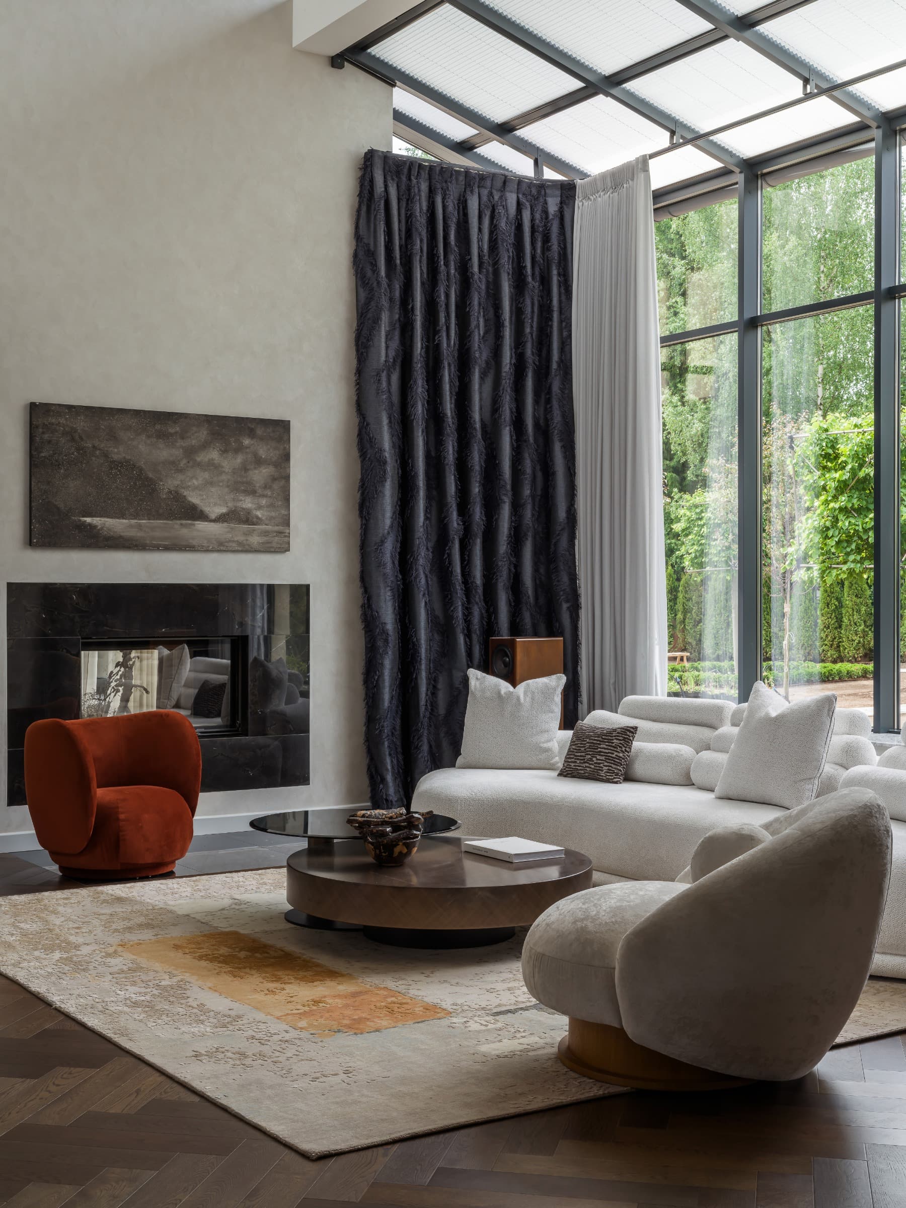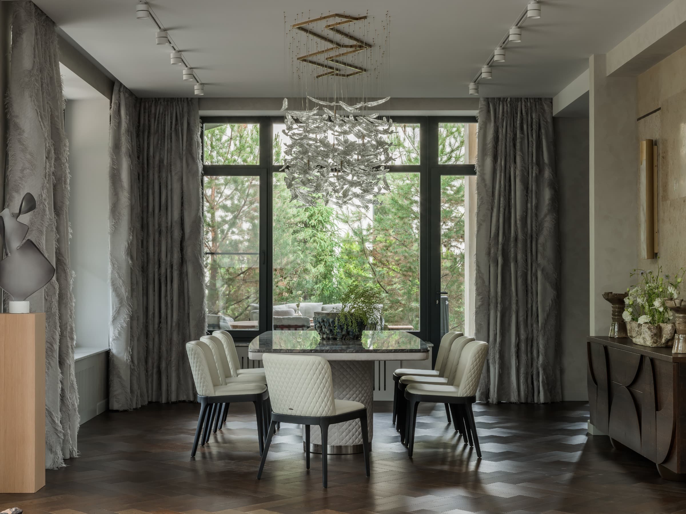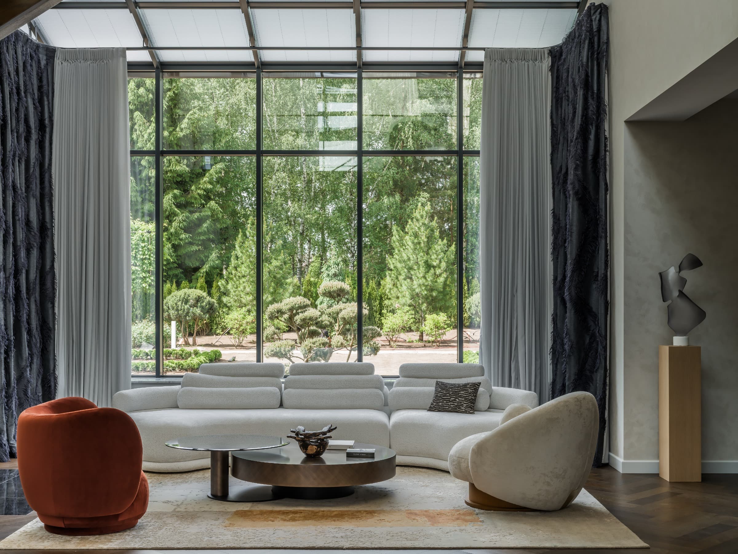 Дизайнер Влада Стеблин Спроектировал загородный дом площадью 418 квадратных метров для пары с детьми. метров в коттеджном поселке «Миллениум Парк» под Москвой. Панорамное остекление, стирающее границы между интерьером и садом, легло в основу концепции всего пространства. Контрастный акцент – темно-синие шторы – подчеркивает динамику естественного света и служит идеальным обрамлением для живописных видов в любое время года.