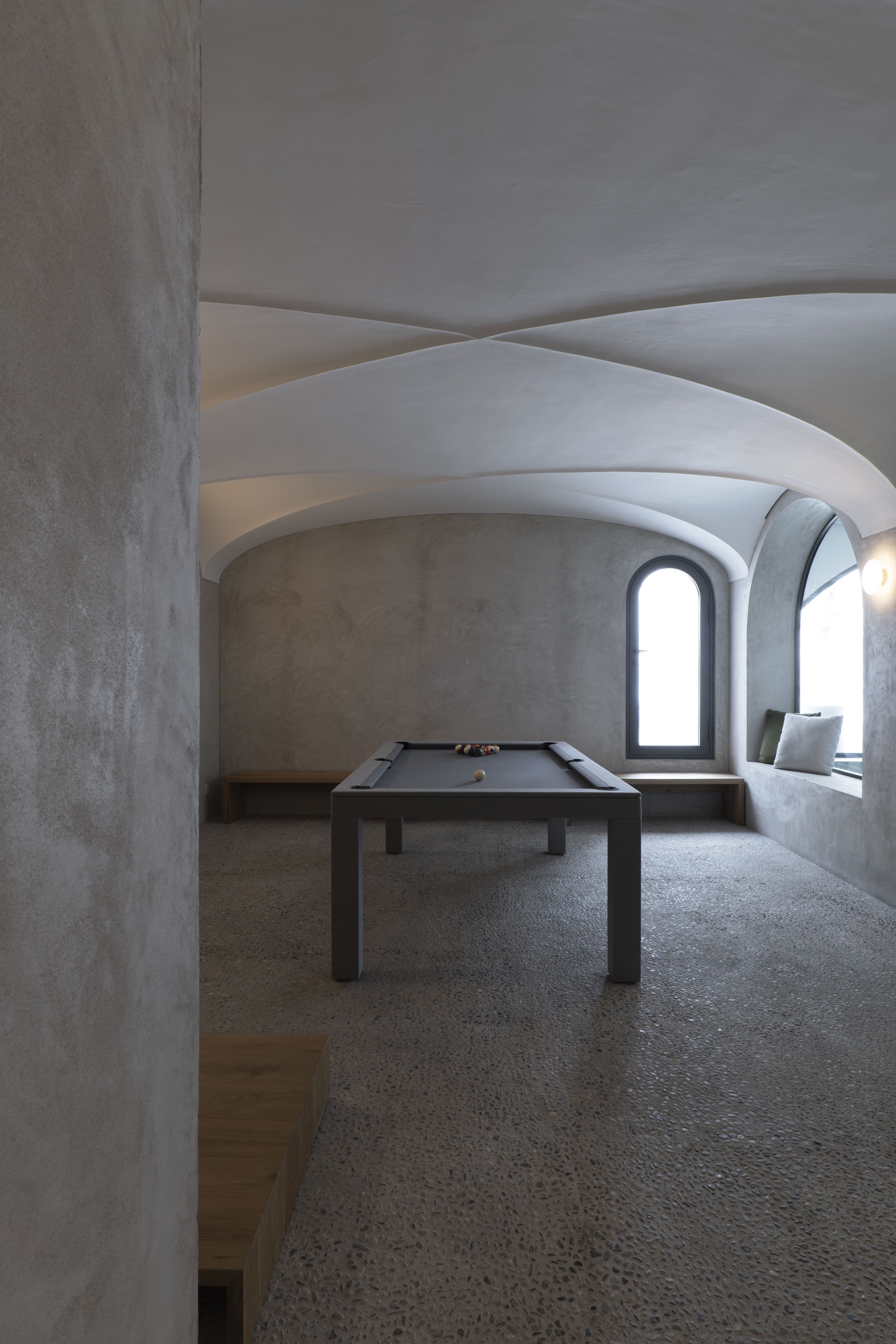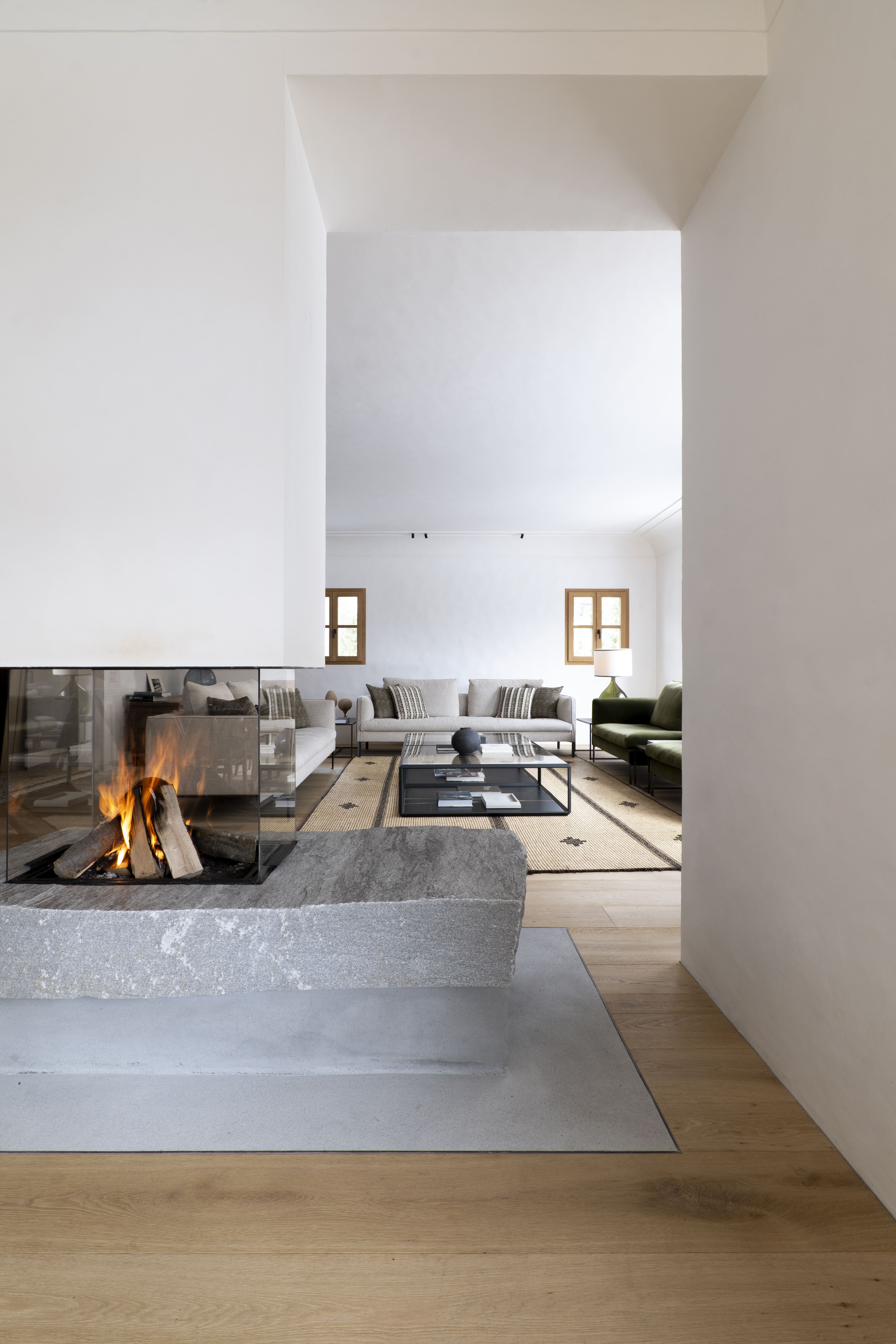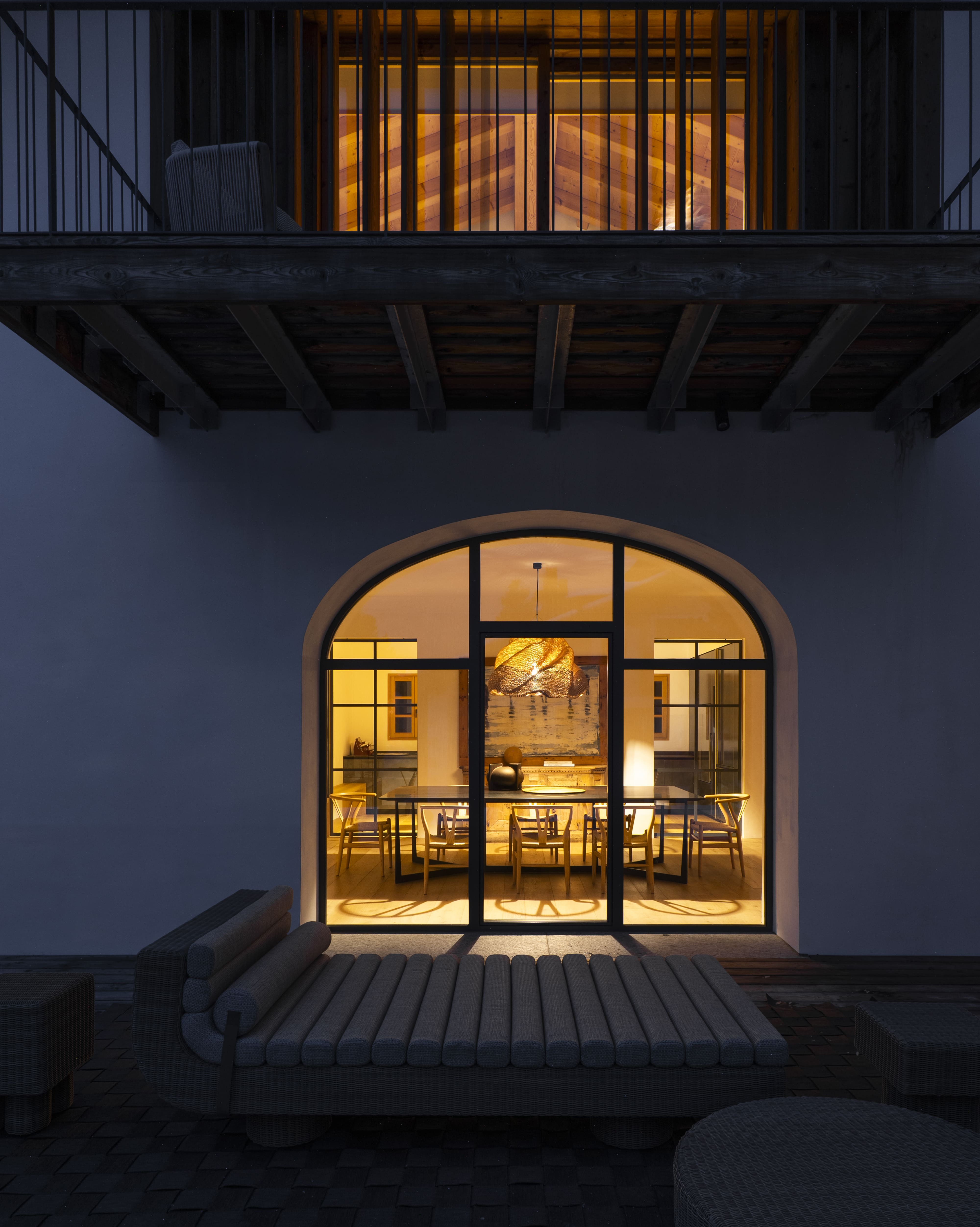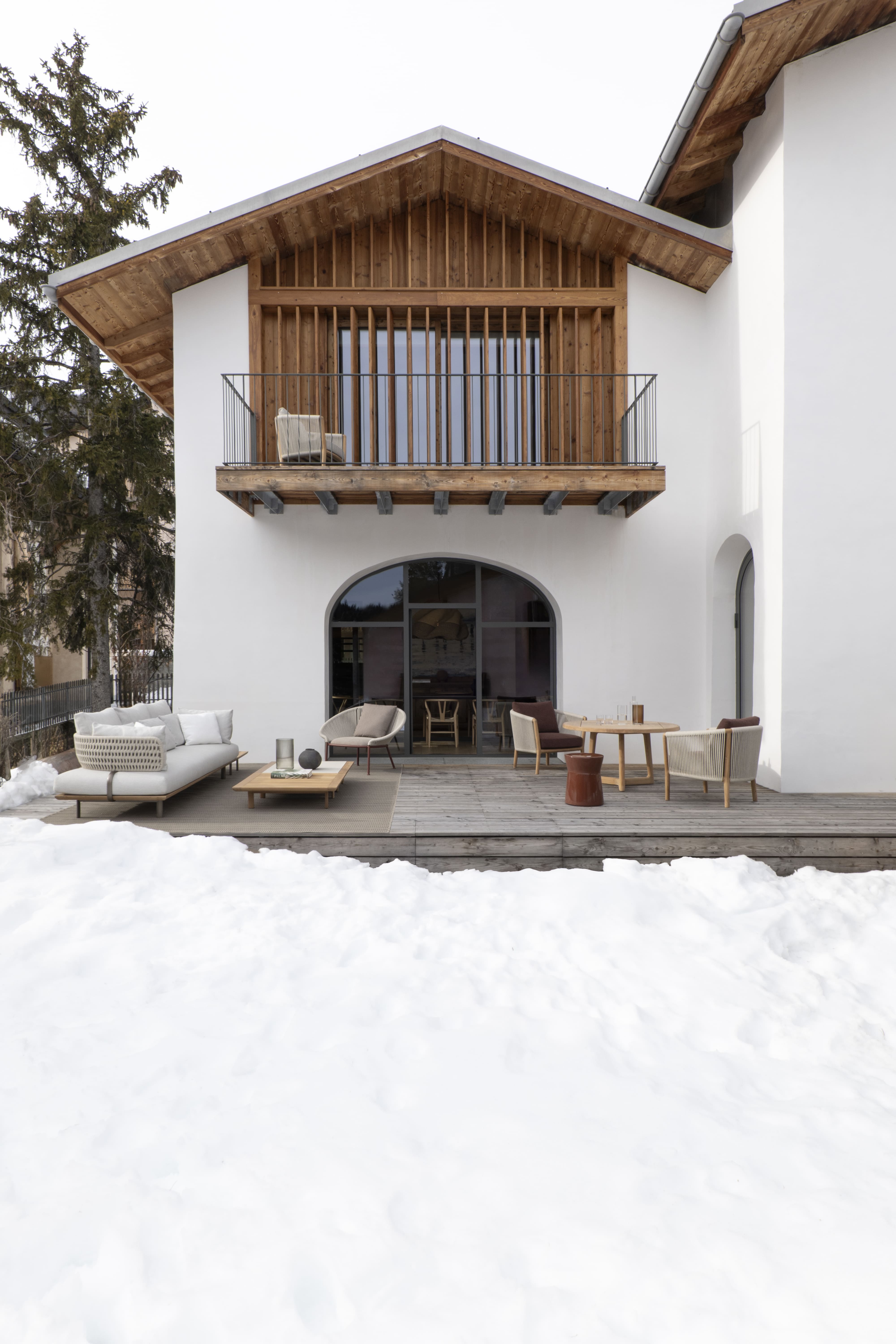 Внешний вид виллы, вступающий в диалог с горным ландшафтом, задуман как естественное продолжение внутреннего пространства. Диван и журнальные столики Sway, разработанные дуэтом Ябу Пушельберг, привносят непринужденную атмосферу в гостиную, а кресла Petalo, разработанные креативным директором Molteni&C Винсентом ван Дуйсеном, приглашают гостей стоять и наслаждаться видом.